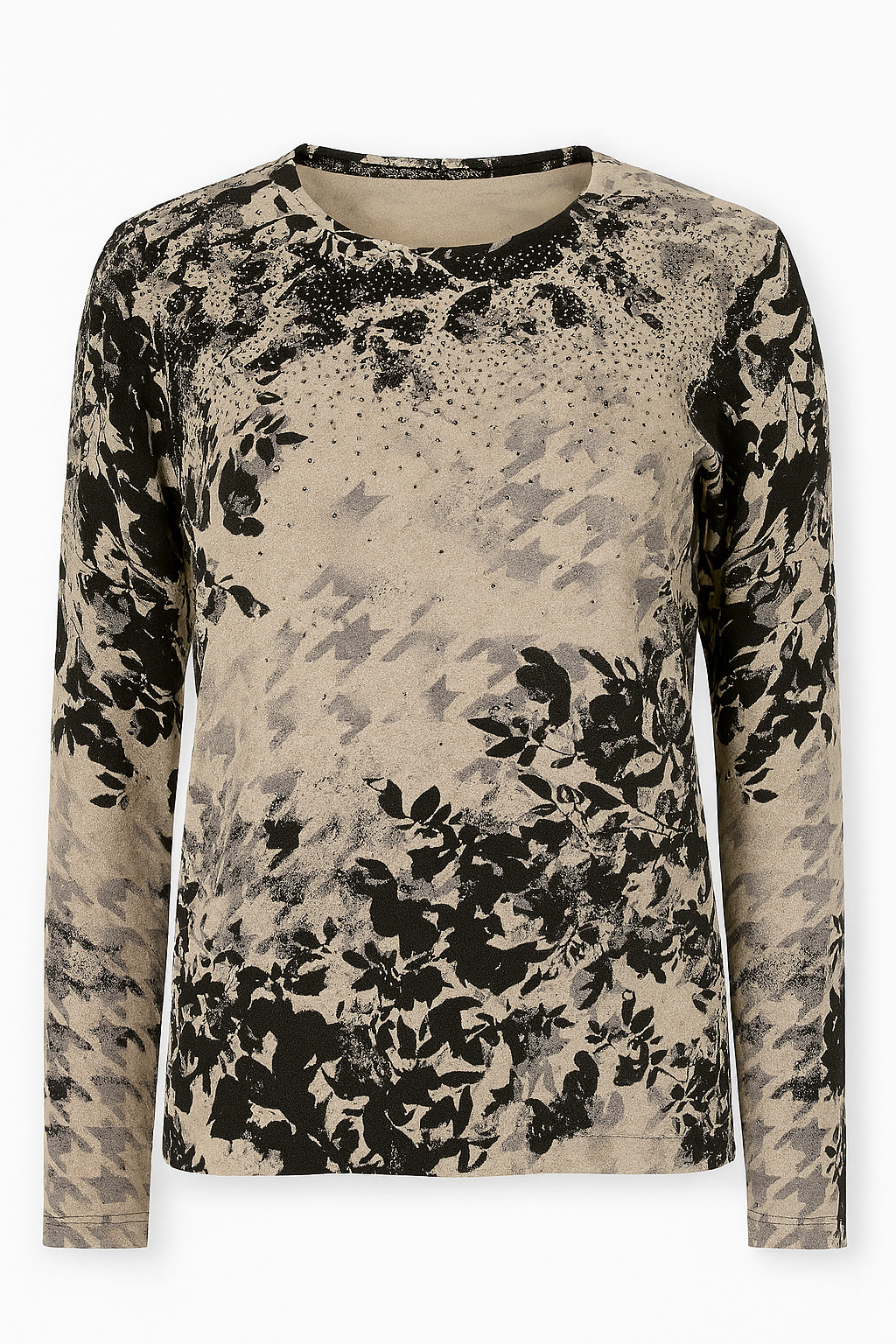 Light top, houndstooth and floral print, diamanté front