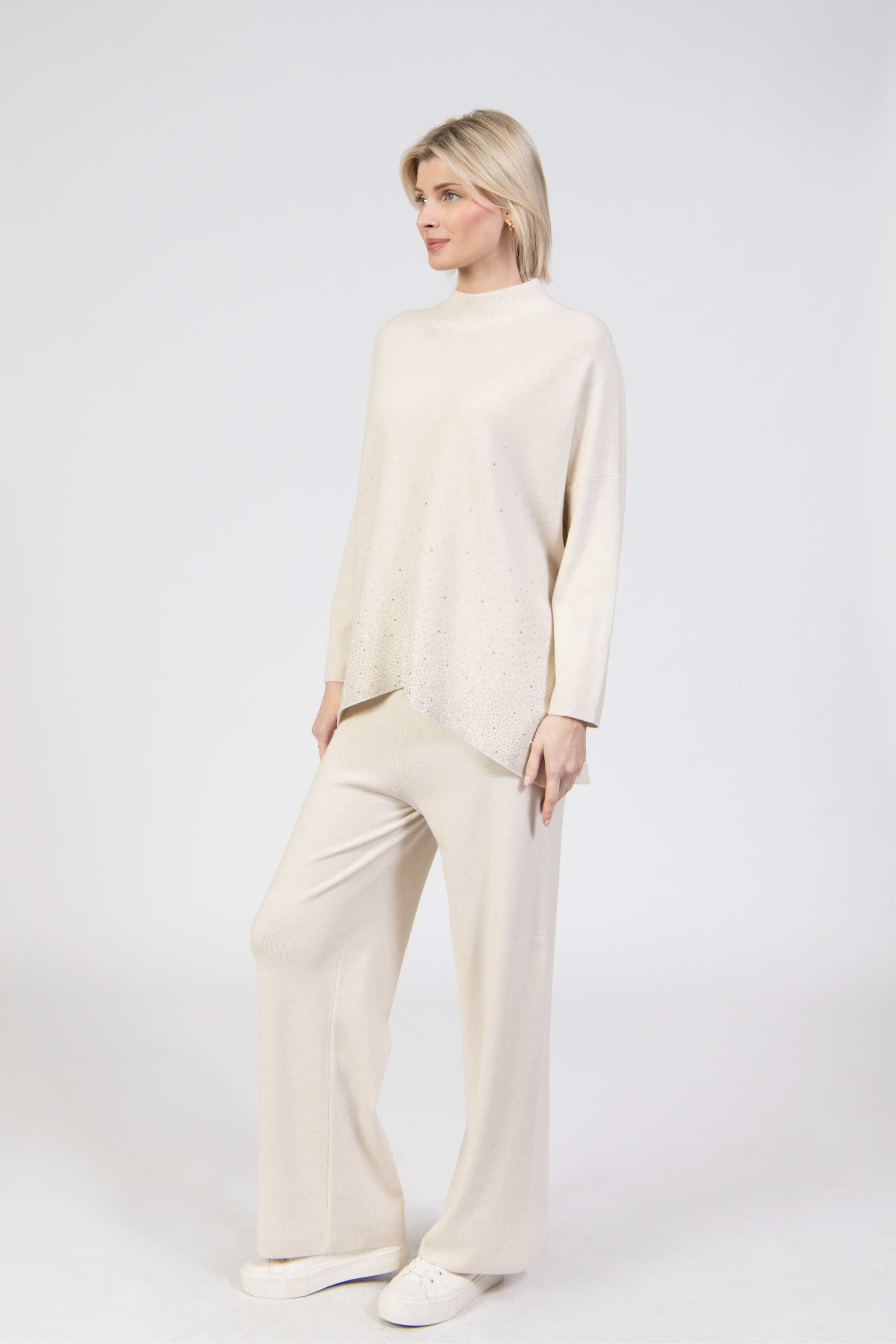 Knit jumper, plain fabric with stone-embellished hem, high round neckline, long sleeve, regular fit, sculpted hem