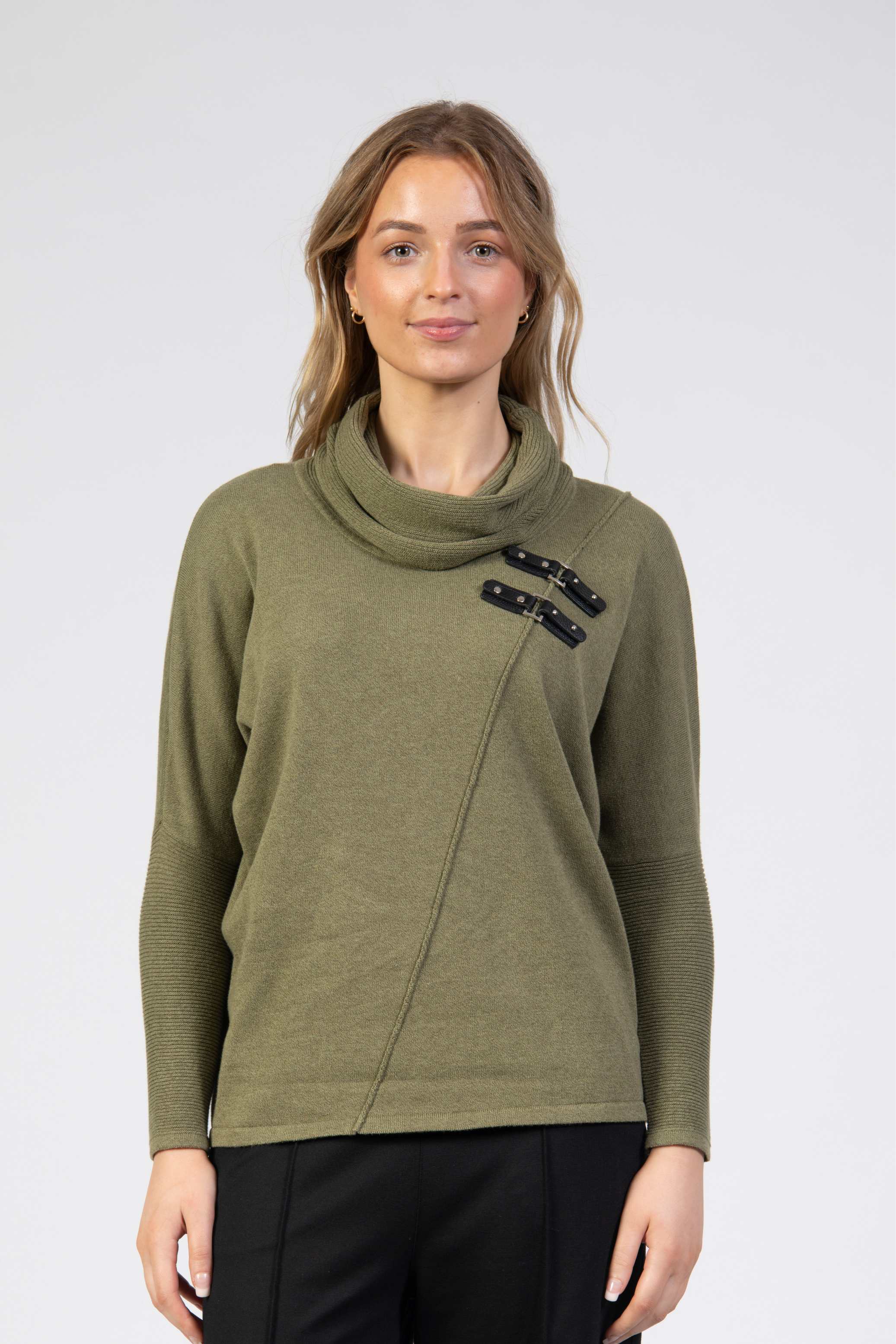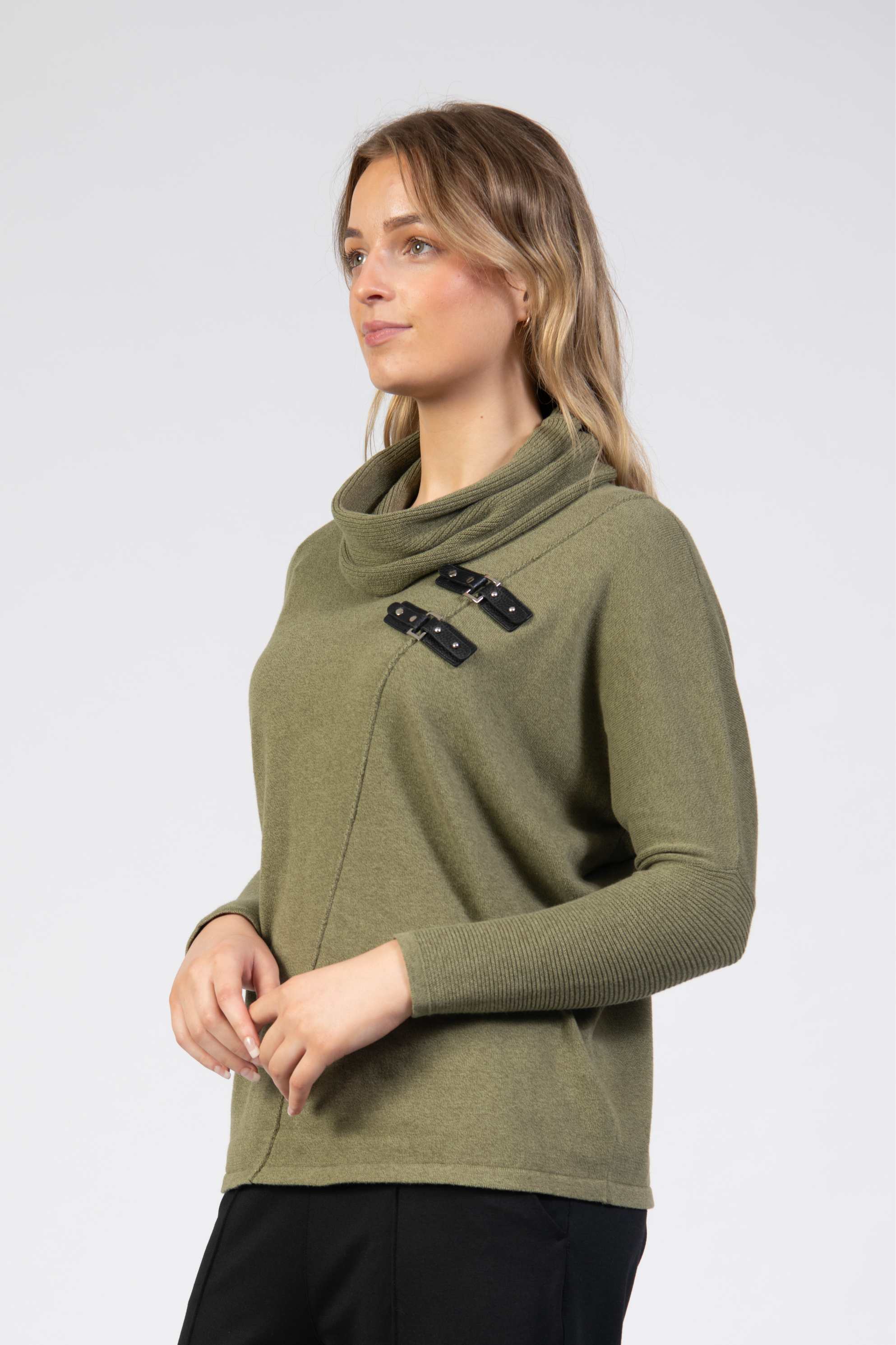 Knit jumper, plain fabric with diagonal seam with 2 front clasp details, cowl neck, long sleeve, slim fit