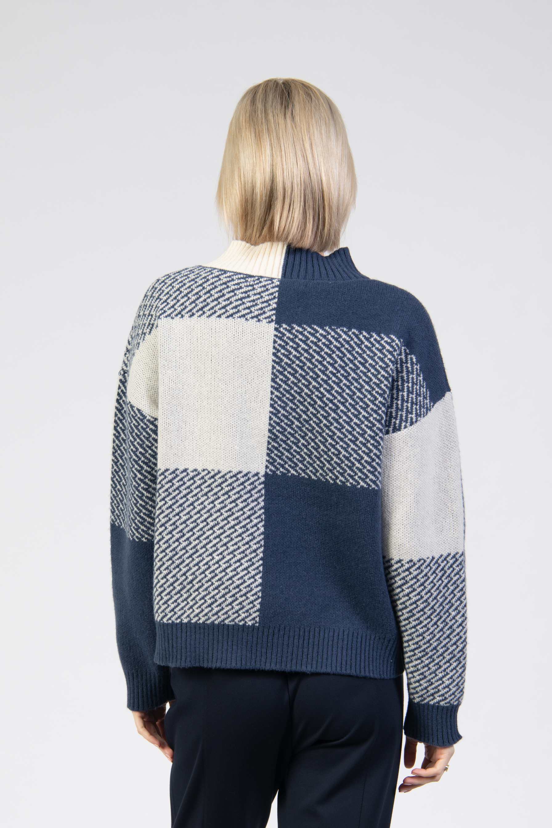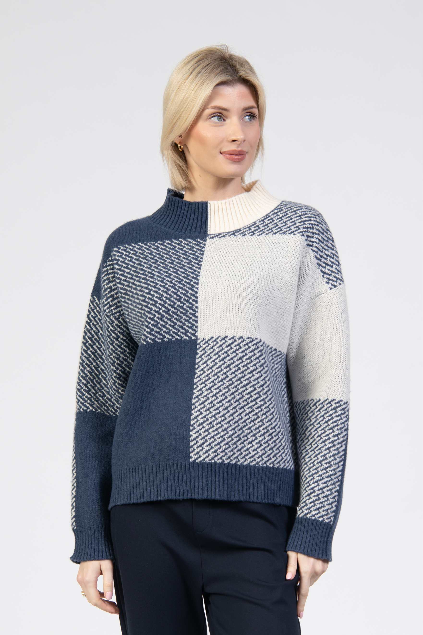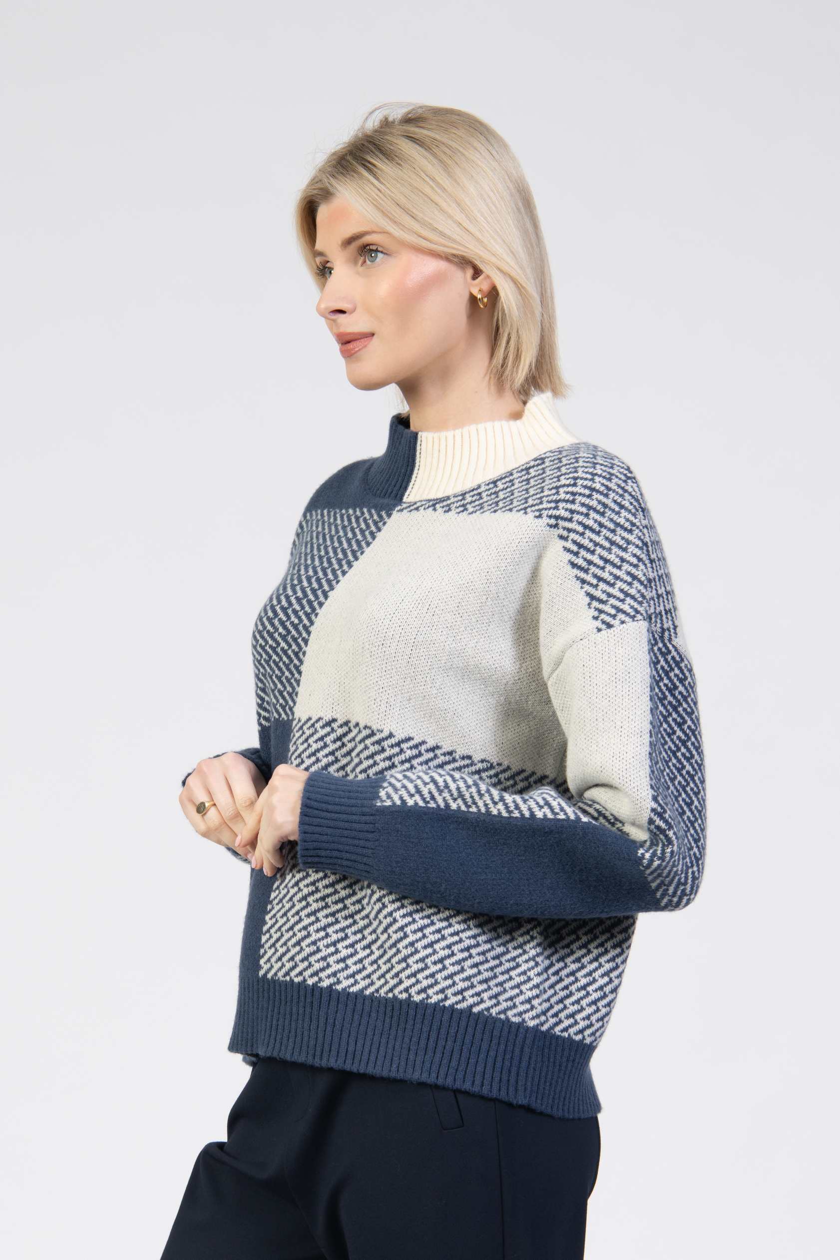 Knit jumper, bold colourblock knit, high ribbed collar, long sleeve, relaxed fit, ribbed cuffs