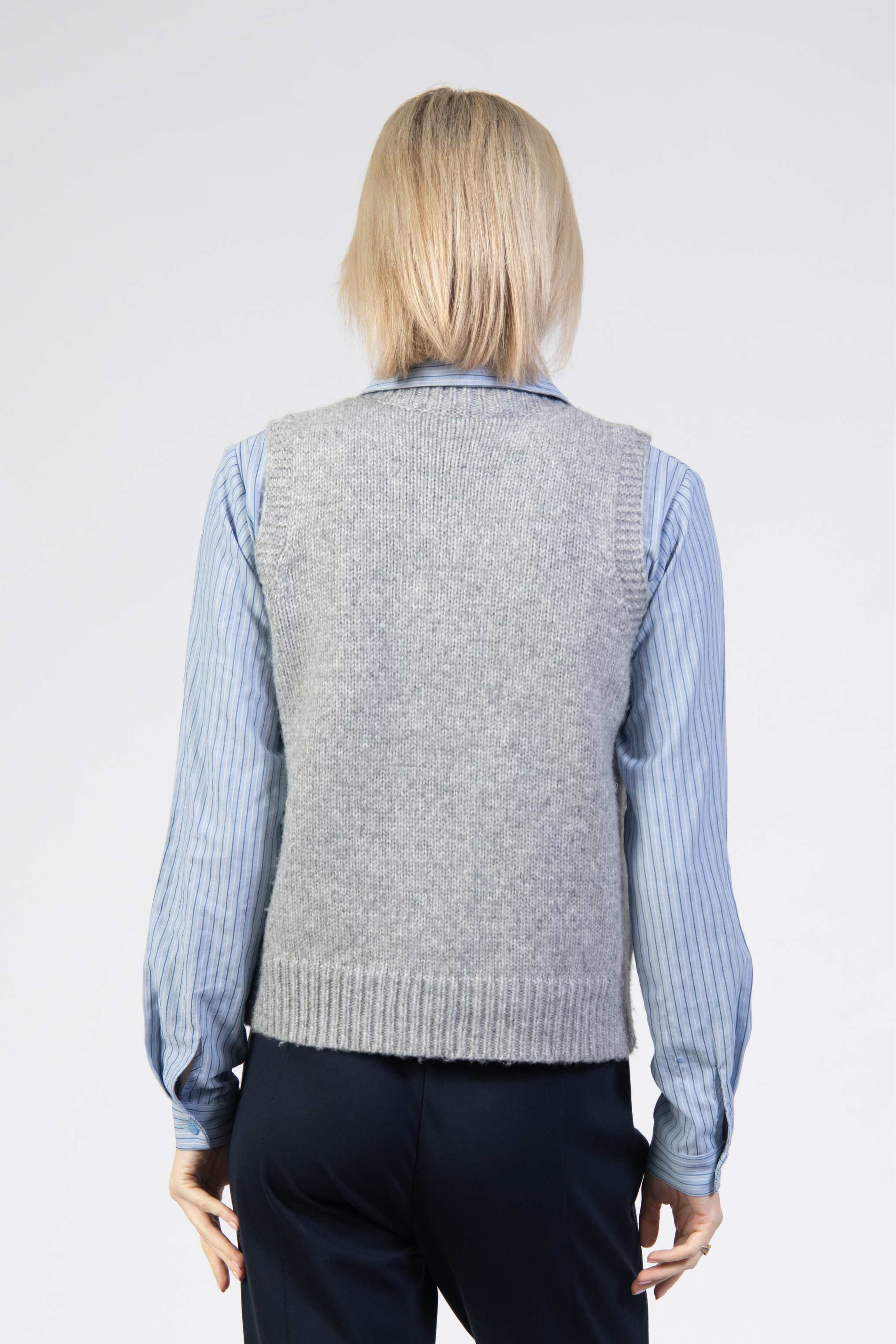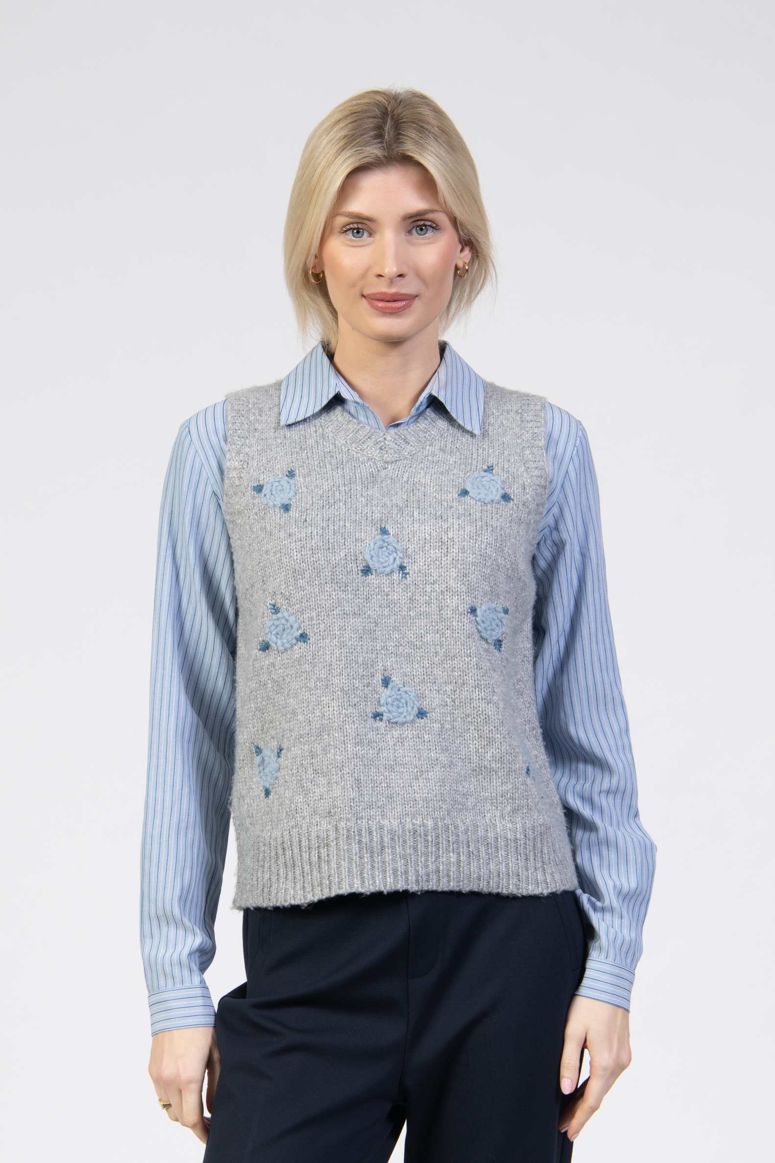 Knit vest with attached shirt, floral textured knit with stripe shirt collar and matching stripe shirt sleeves, round neck, long sleeve, regular fit