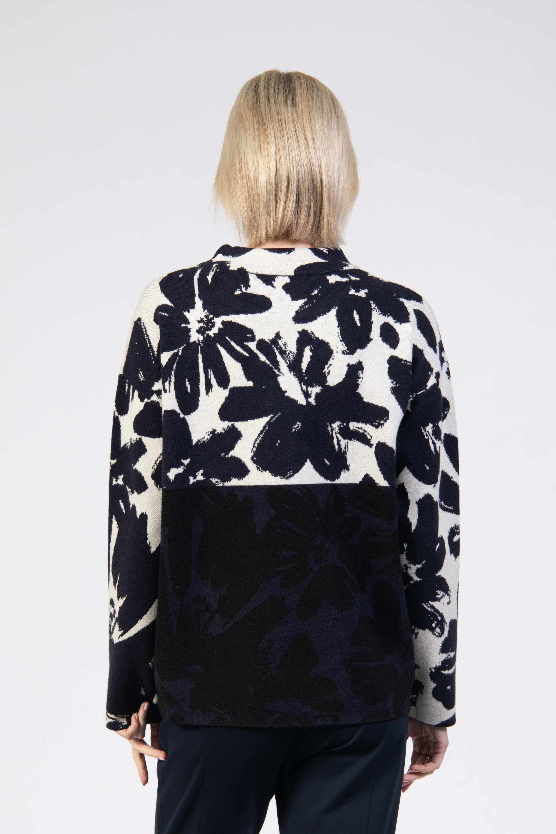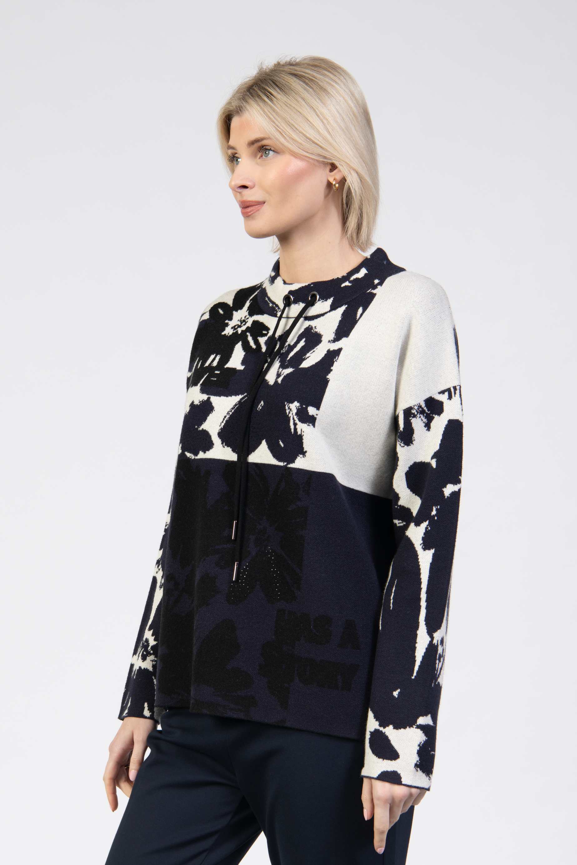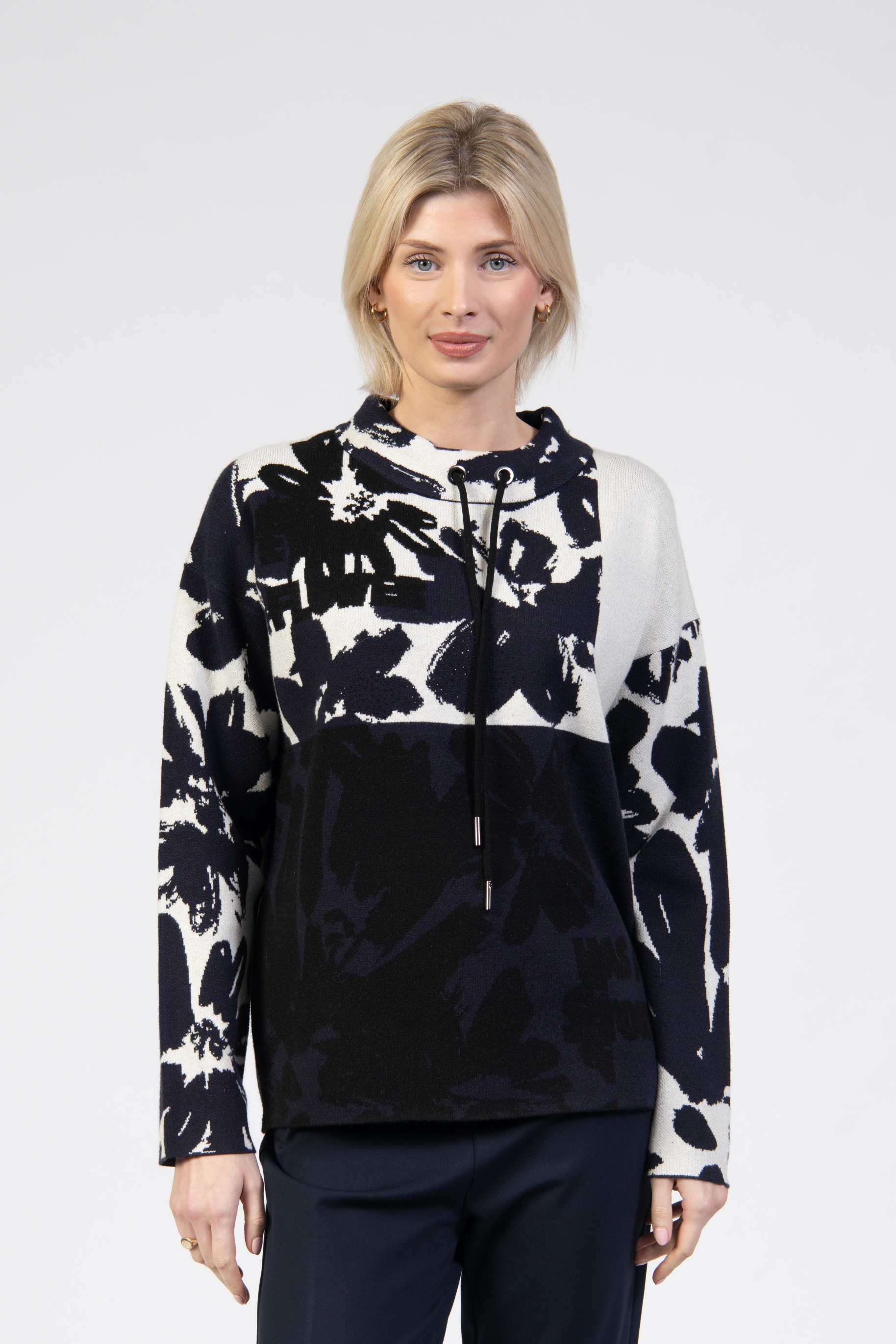 Knit jumper, colourblock with floral motifs and stone details, grown-on neckline with functional cord, long sleeve, relaxed fit