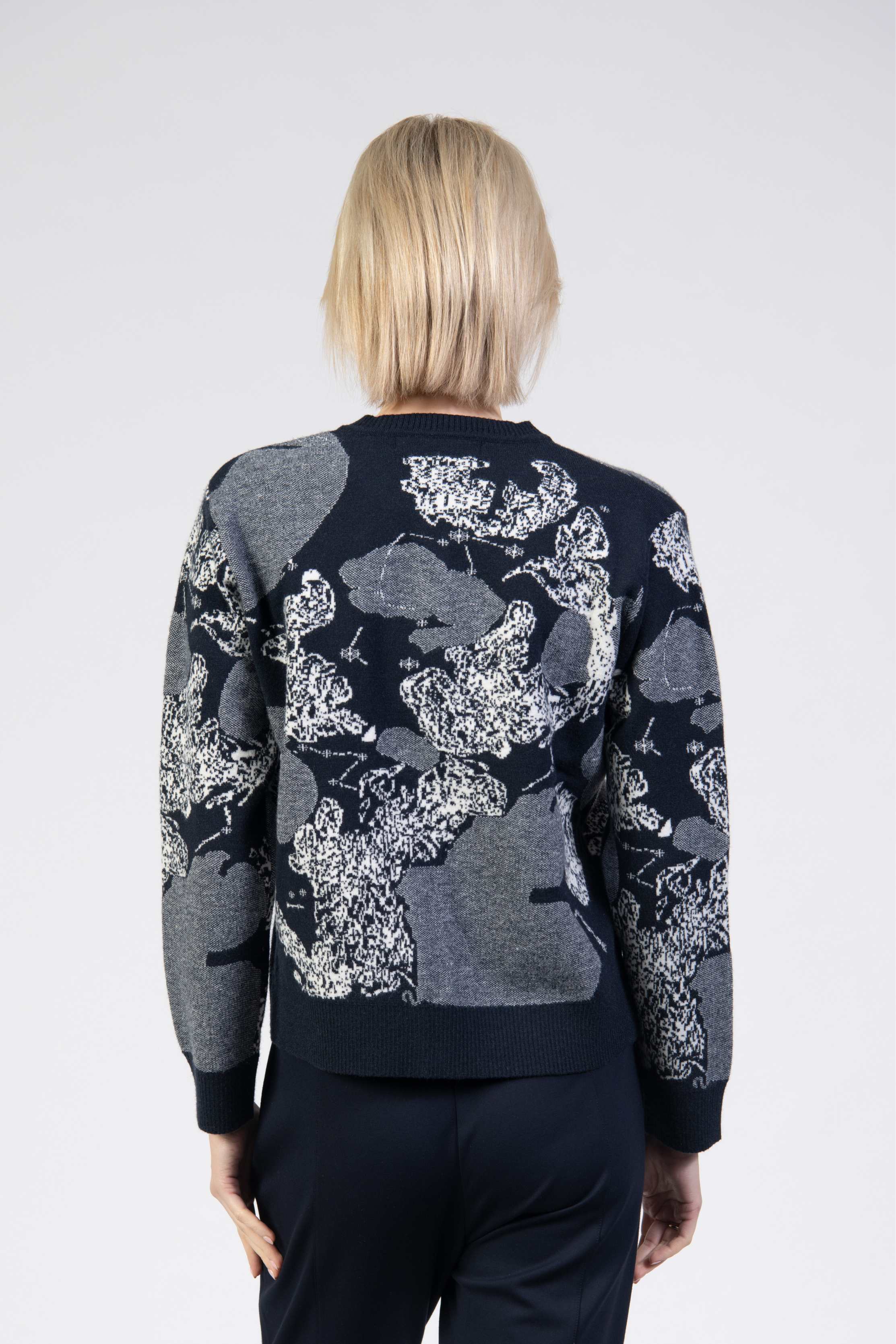 Knit cardigan, abstract floral design, round neck, long sleeve, regular fit, full button-through, ribbed hem, cuffs, and neckline