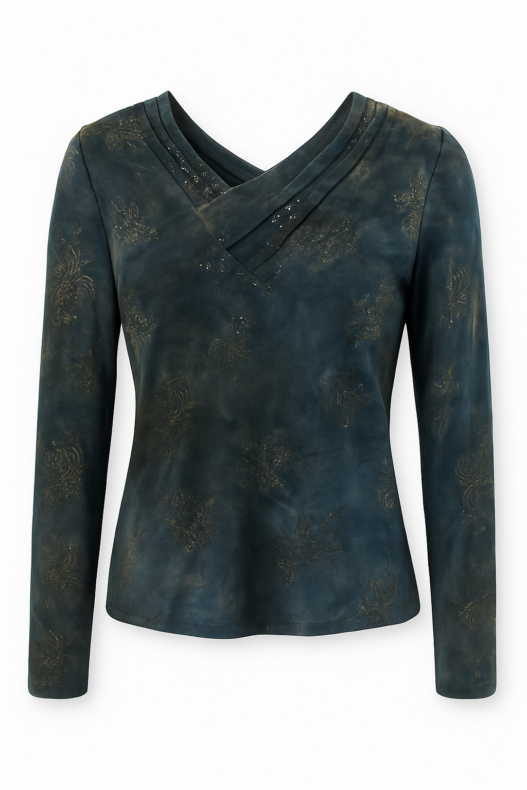 Pleated V-neck devoré blouse, long sleeve, glitter flower print, stretchy