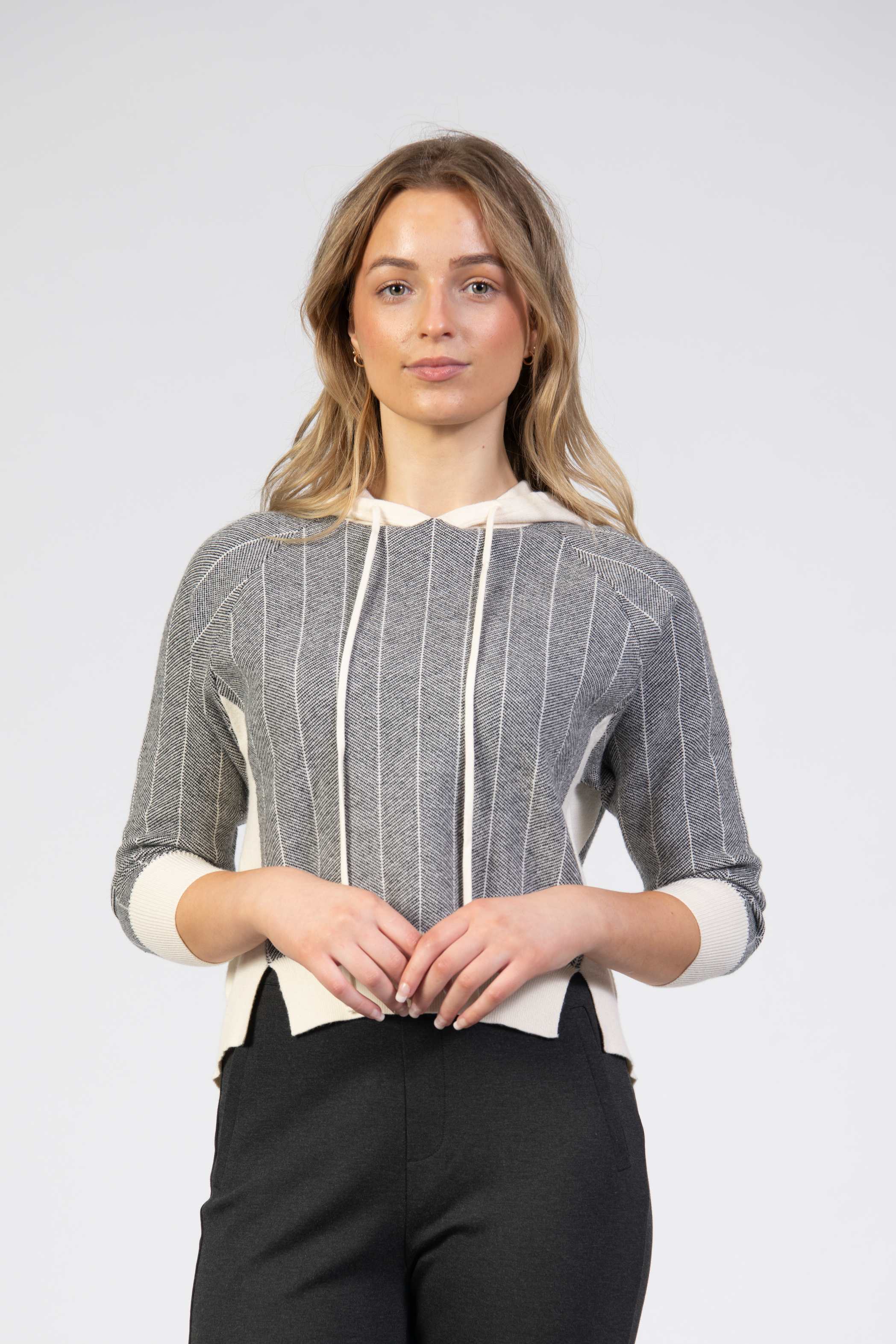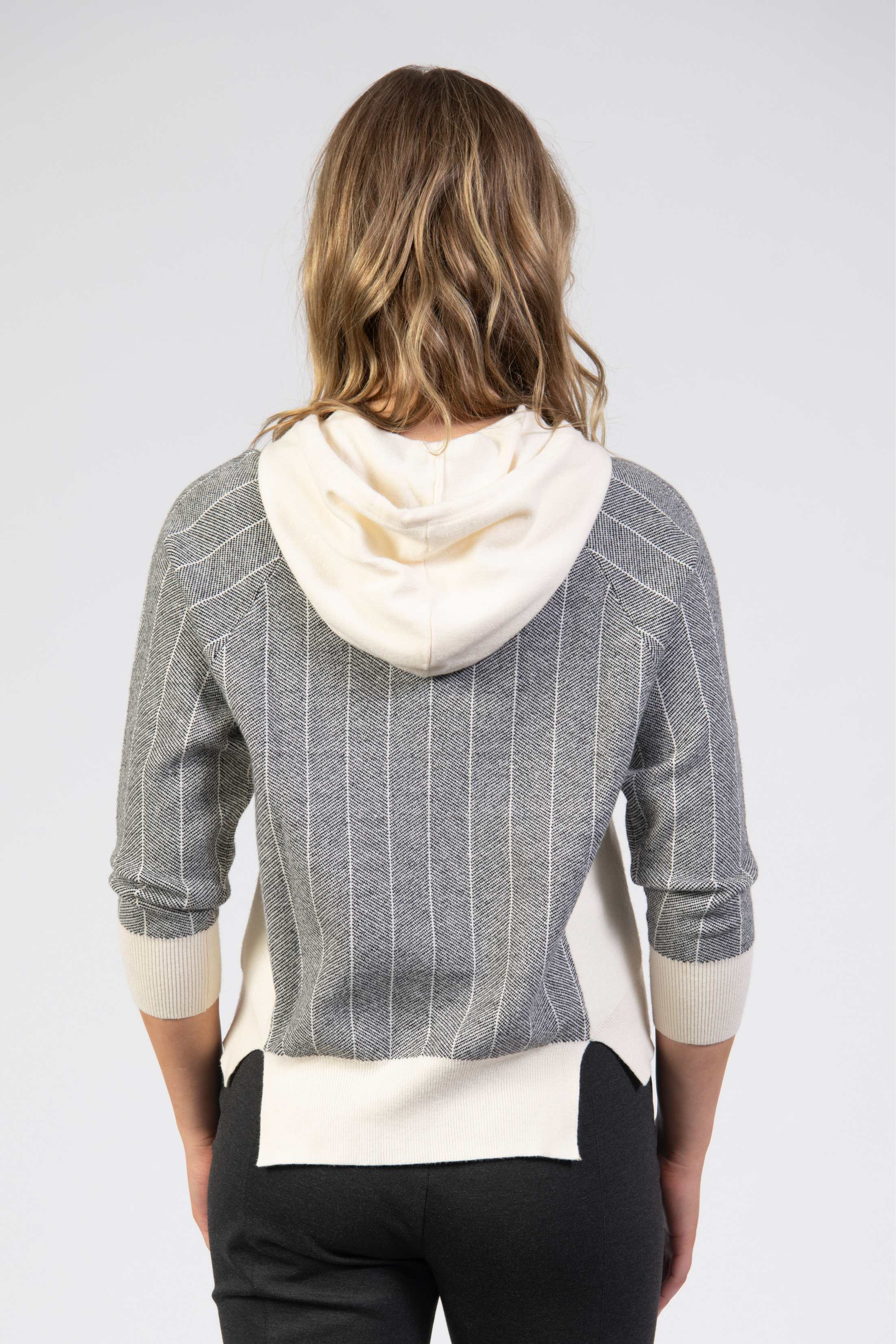 Knit hoodie, abstract printed with tonal side panels, attached hood with cords, high-low hem, ¾ sleeve, side slits, regular fit
