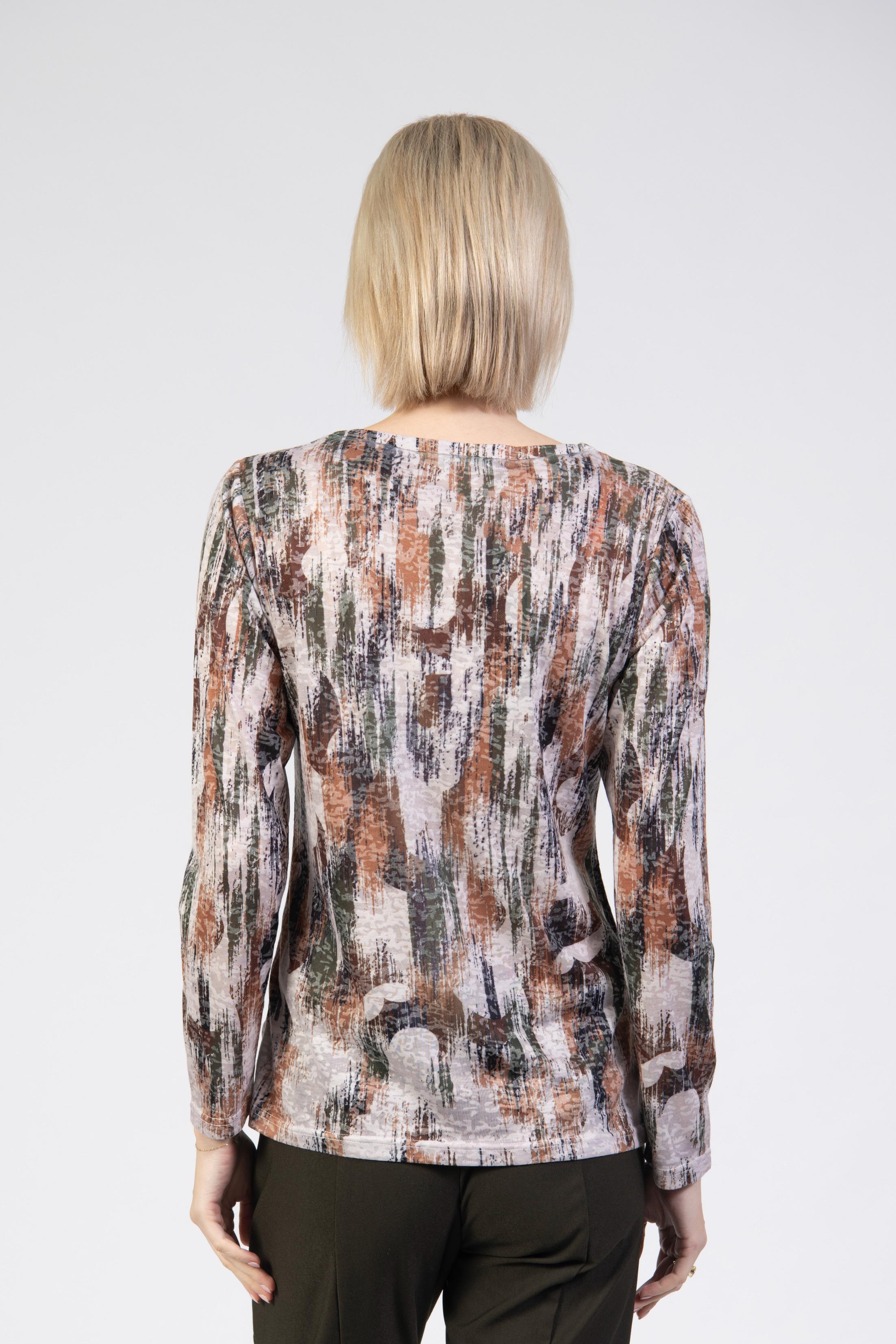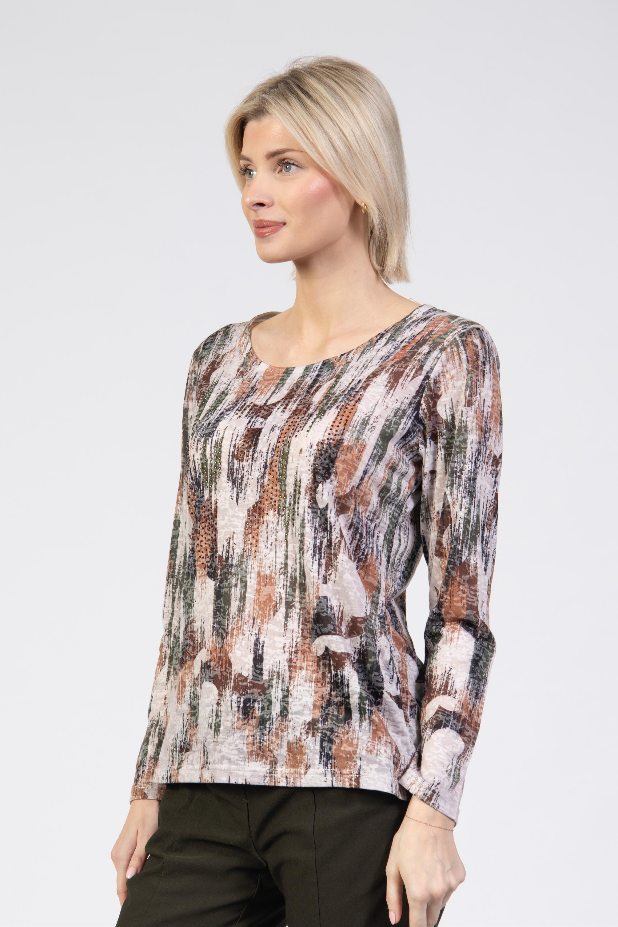 Printed top, burn out jersey, abstract print with attached diamantés, round neck, long sleeve, regular fit
