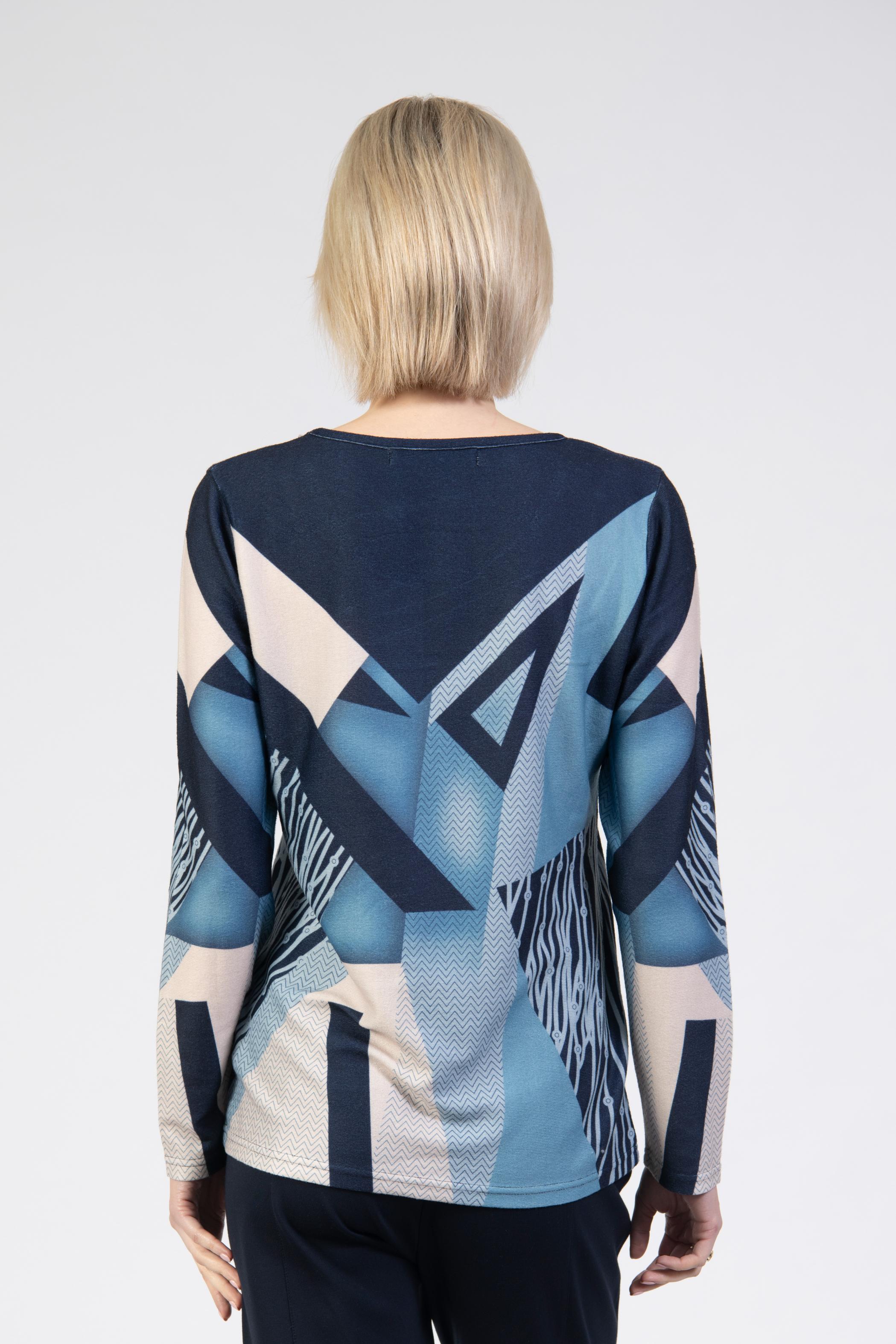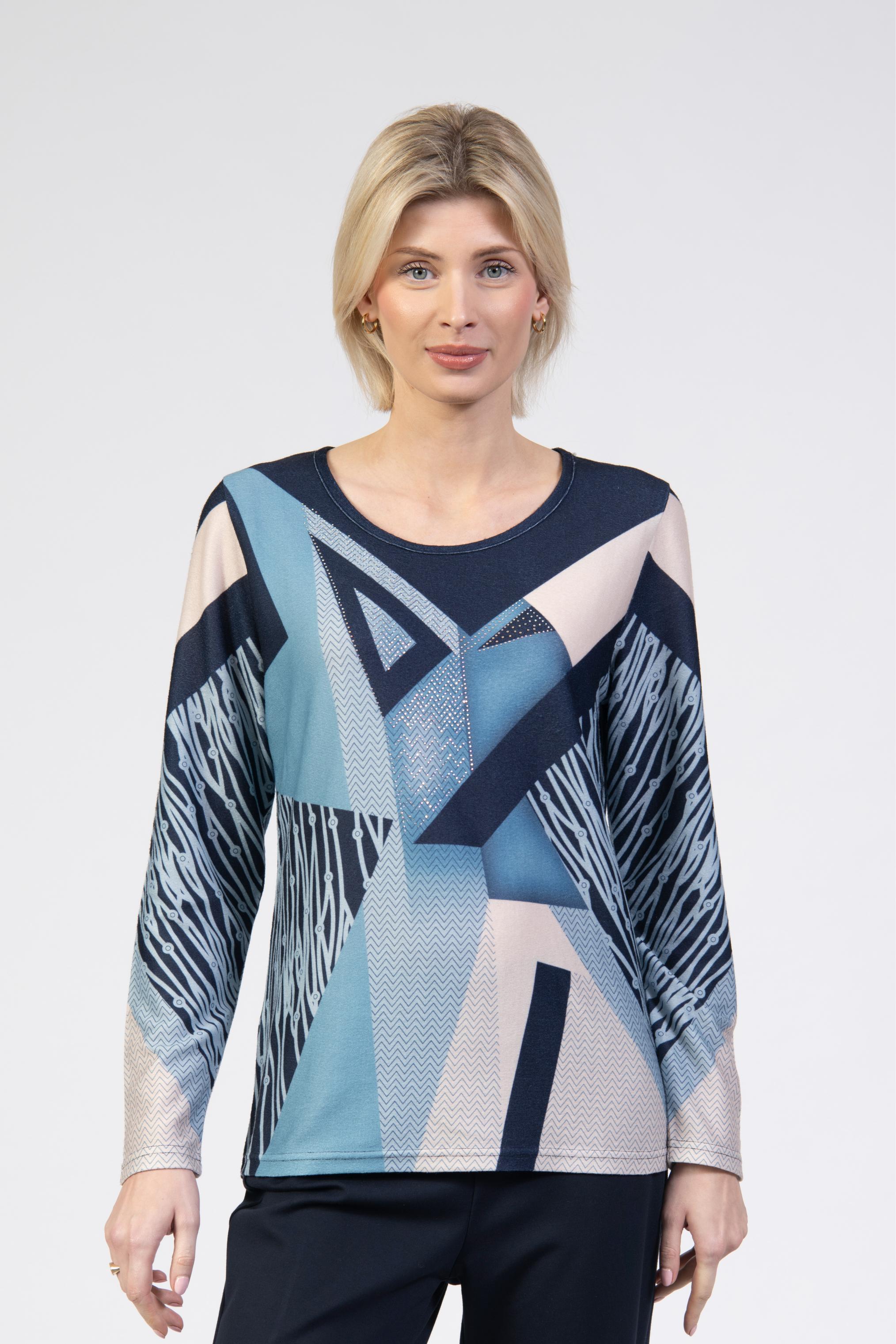 Knit top, bold abstract print with attached diamantés, round neck, long sleeve, regular fit