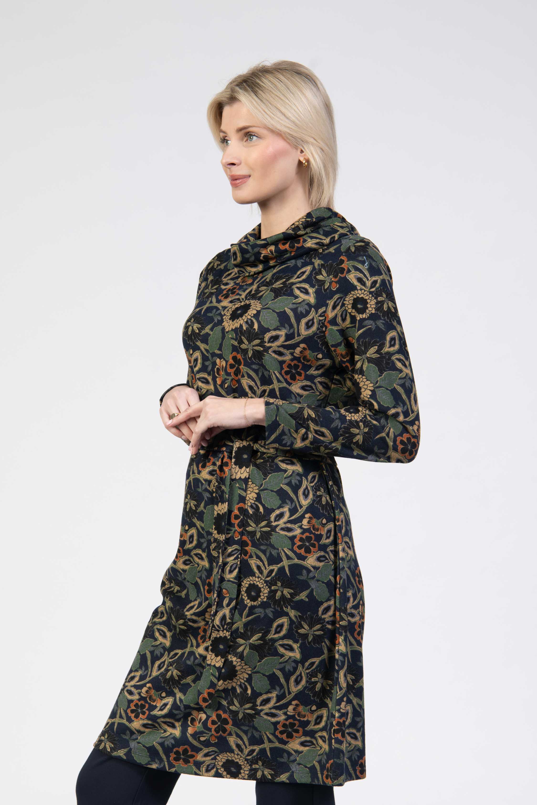 Tunic dress, floral print, super soft fabric, cowl neck, long sleeve, regular fit, matching belt, side pockets