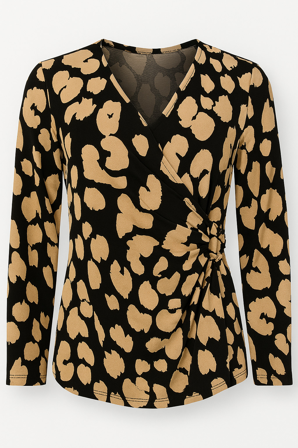 Jersey top, animal-inspired print, front crossover design, V-neck, ¾ sleeve, regular fit, gold clasp detail at front side