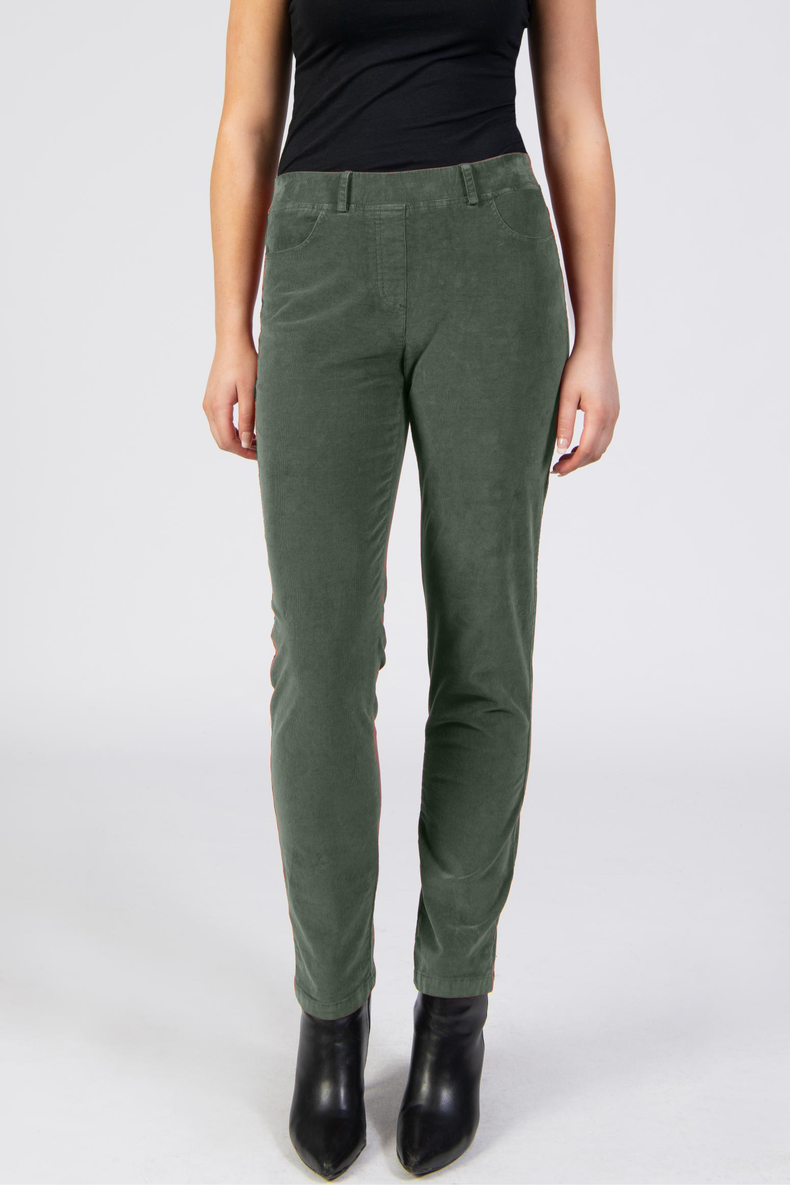 Cord velvet trousers, khaki, slim, full length, elastic waist