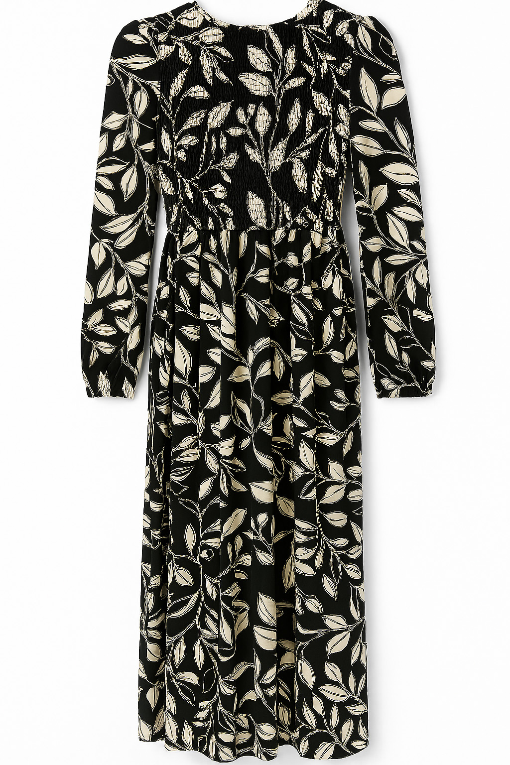 Naturalistic print super-soft long dress, smocking elastic on the body for better fit, long sleeves, slightly puffed shoulders