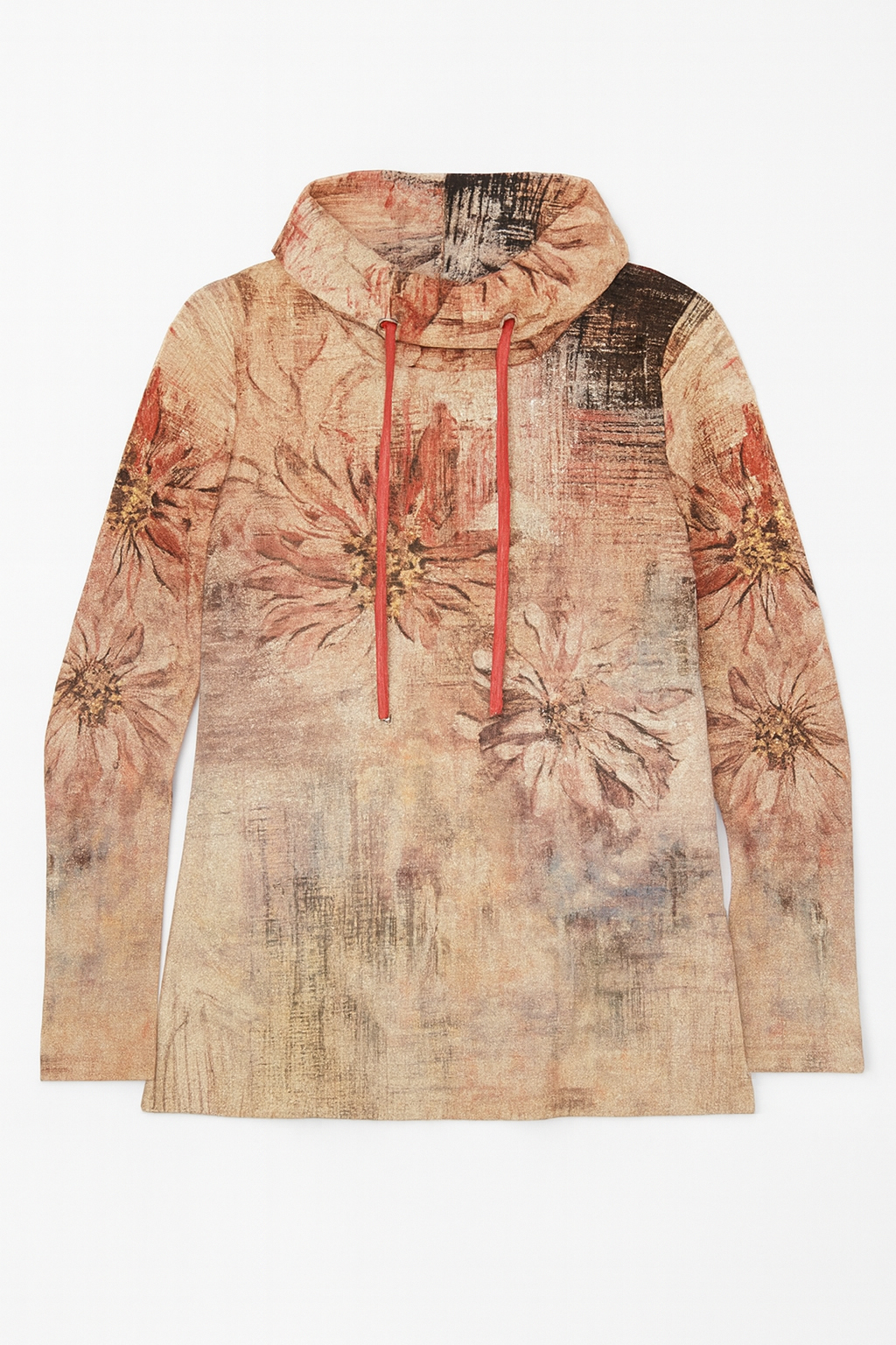 Abstract floral print warm top, cowl neck, long sleeves, cord detail, relaxed fit