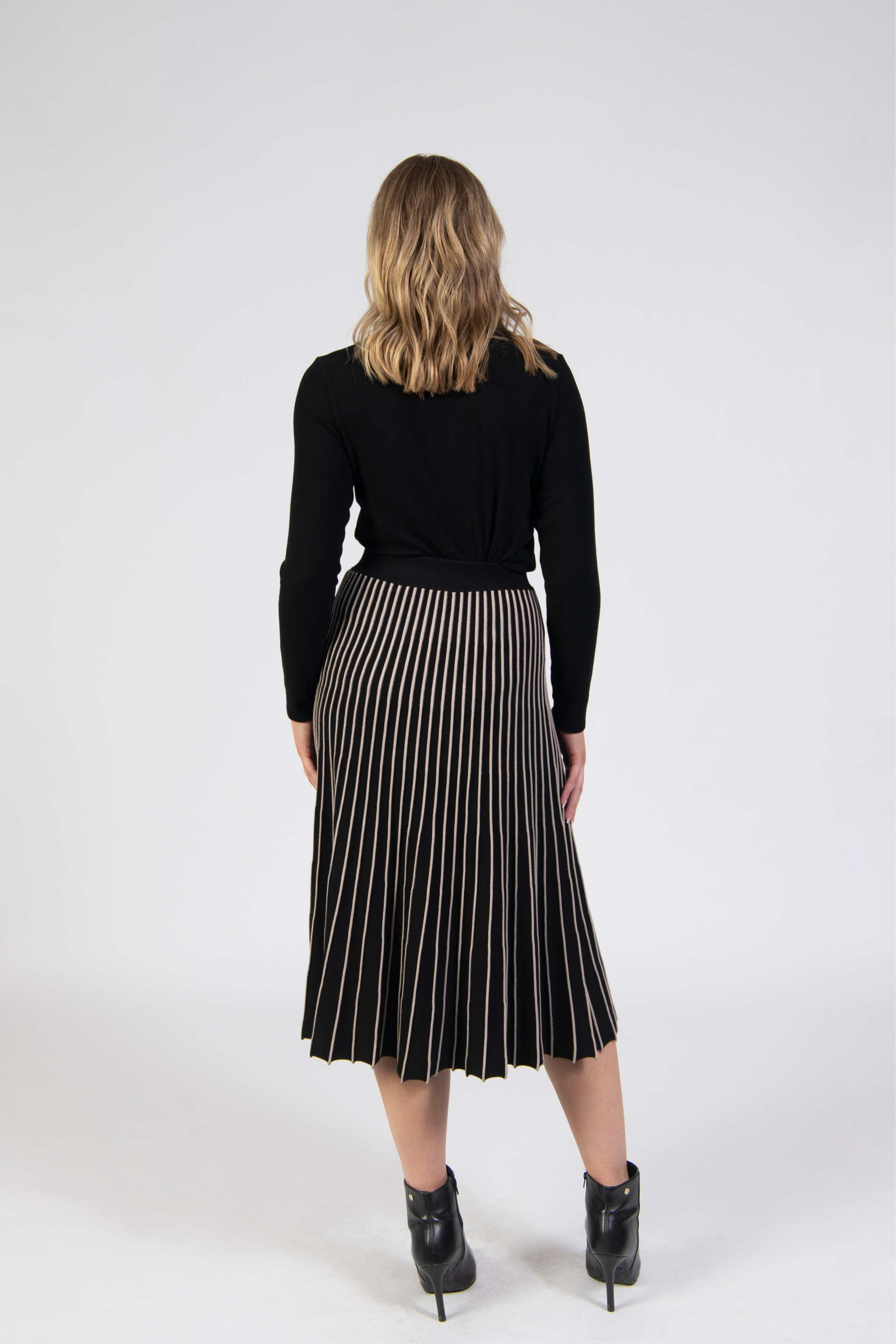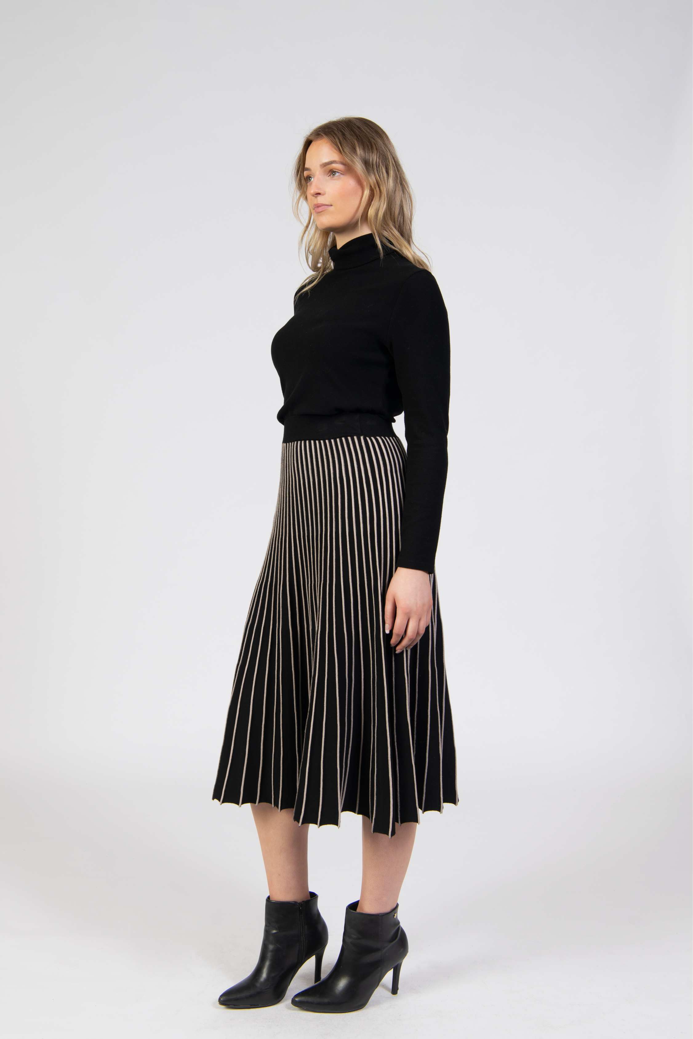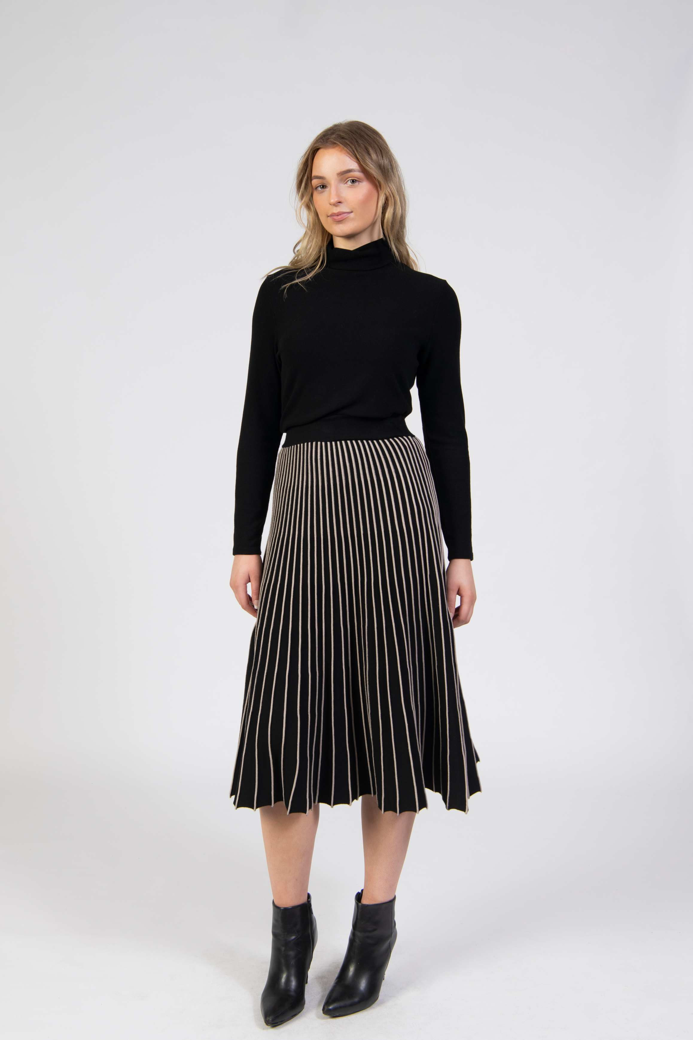 Skirt, A-line pleated knit, contrast folded detail, midi length, mid waist
