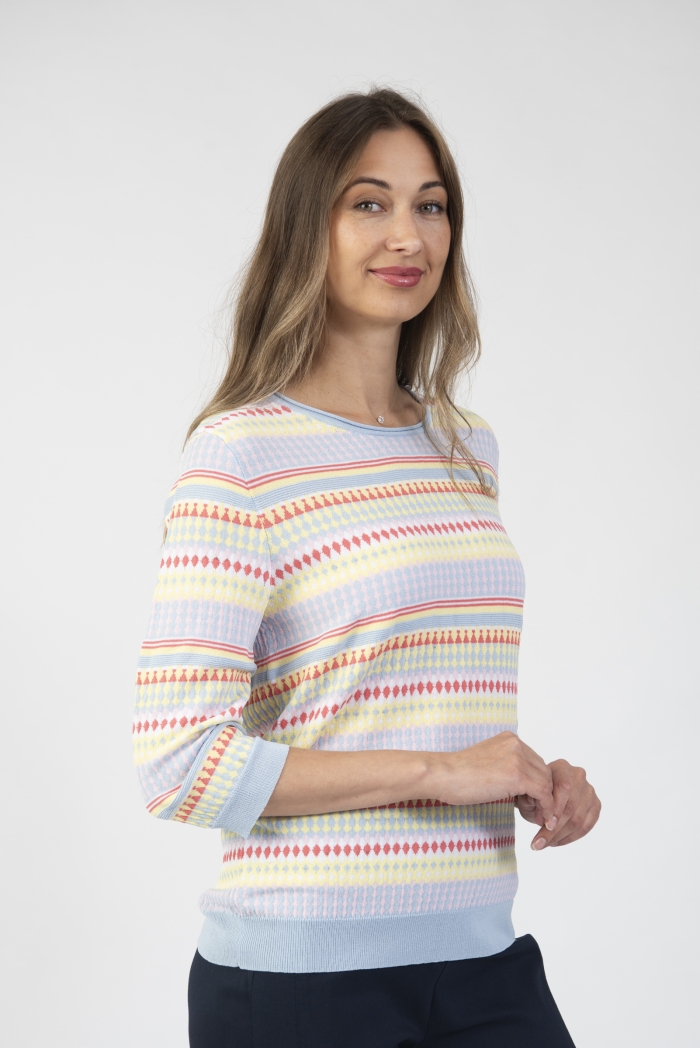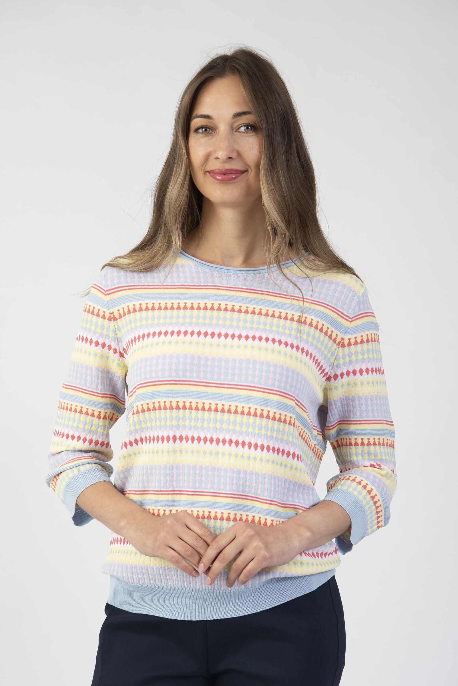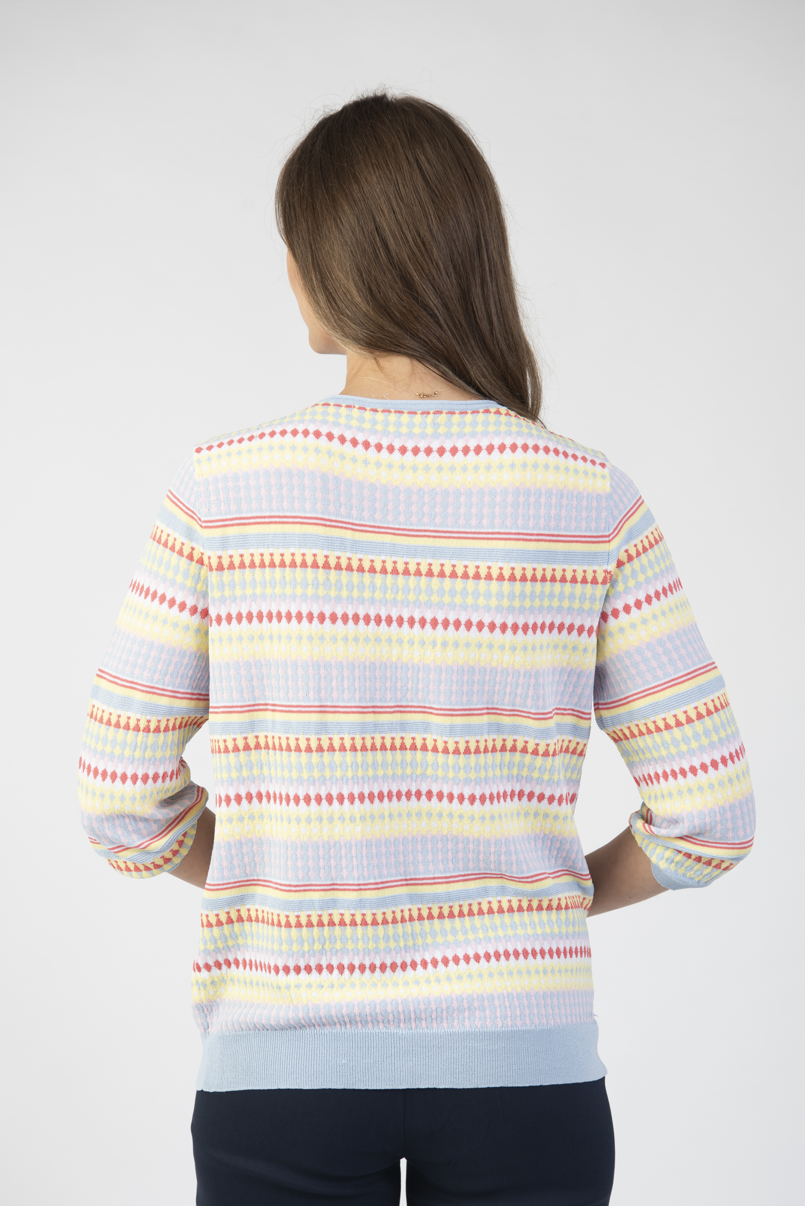Light round neck sweater with 3/4 sleeves & abstract stripe