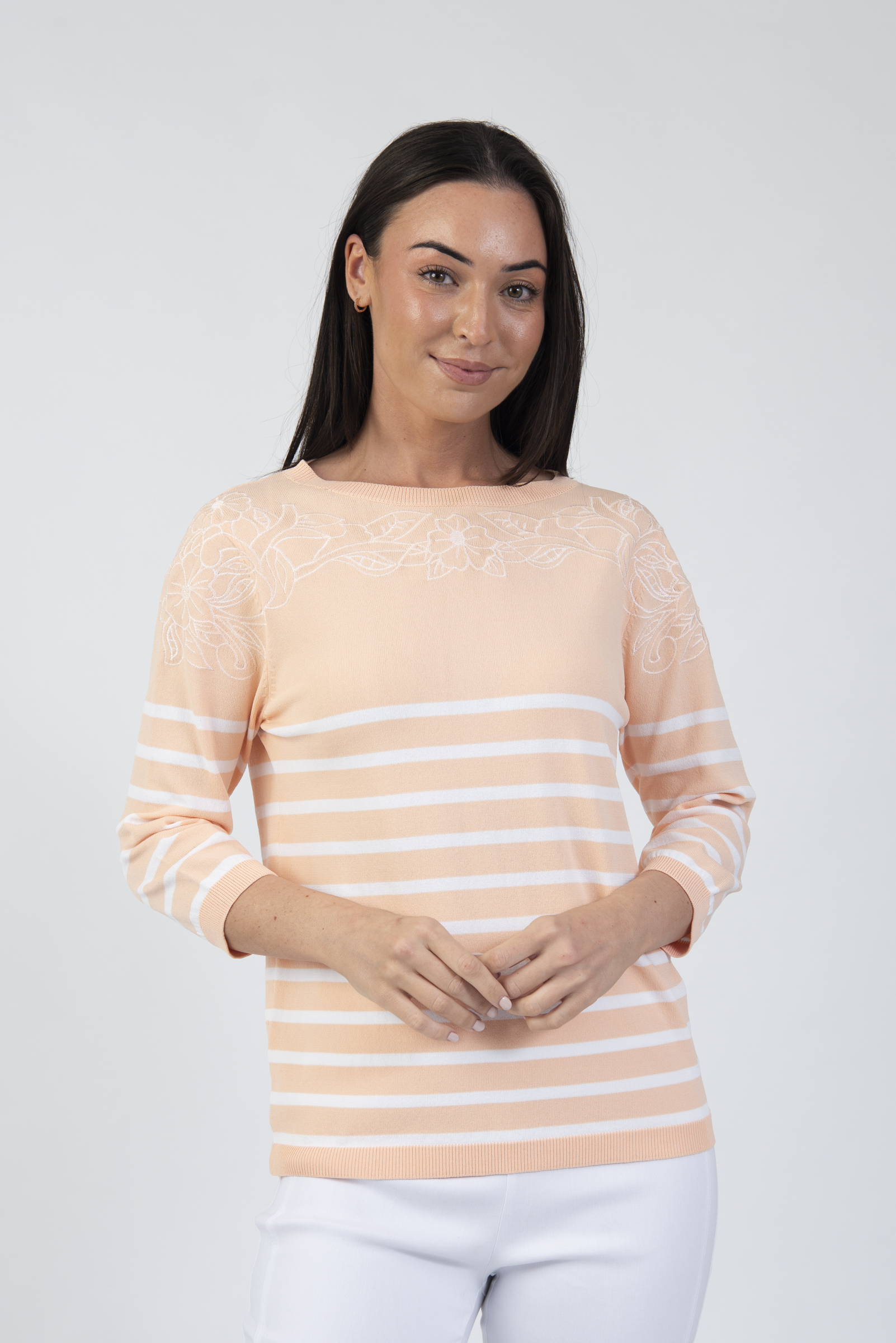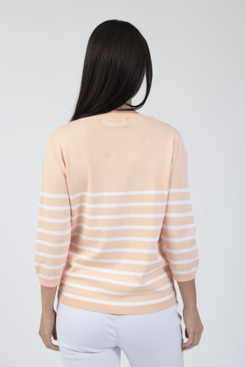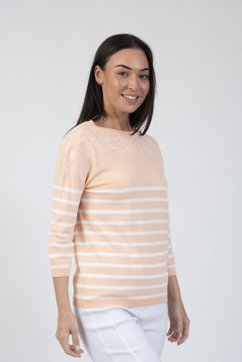Striped round neck sweater with 3/4 length sleeves & floral detail neckline