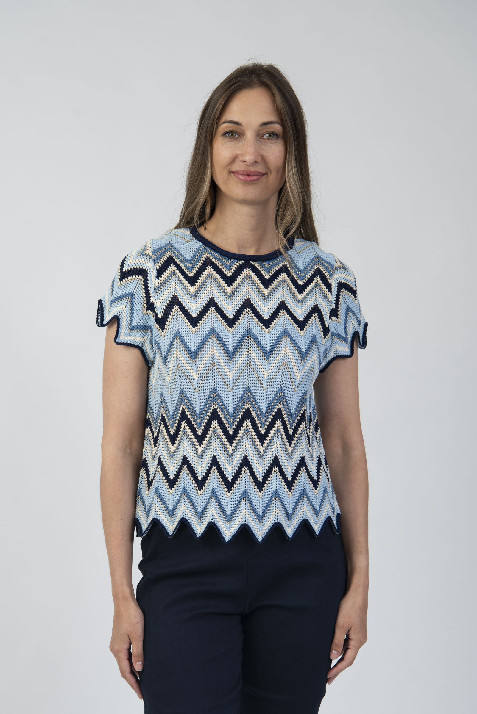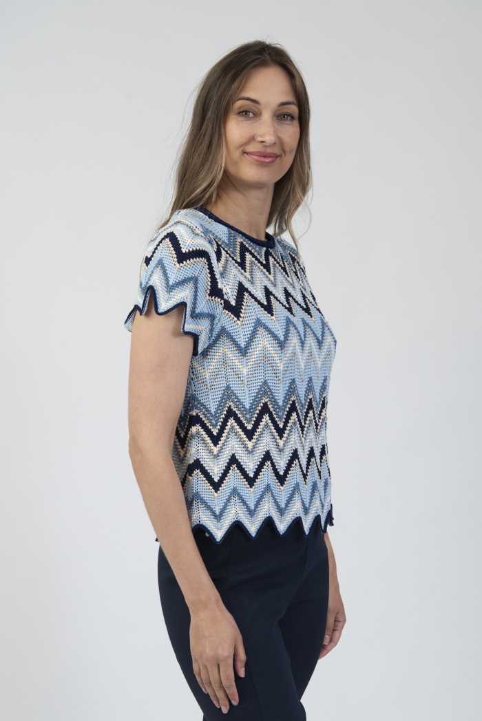Chevron textured knit round neck top with short sleeves