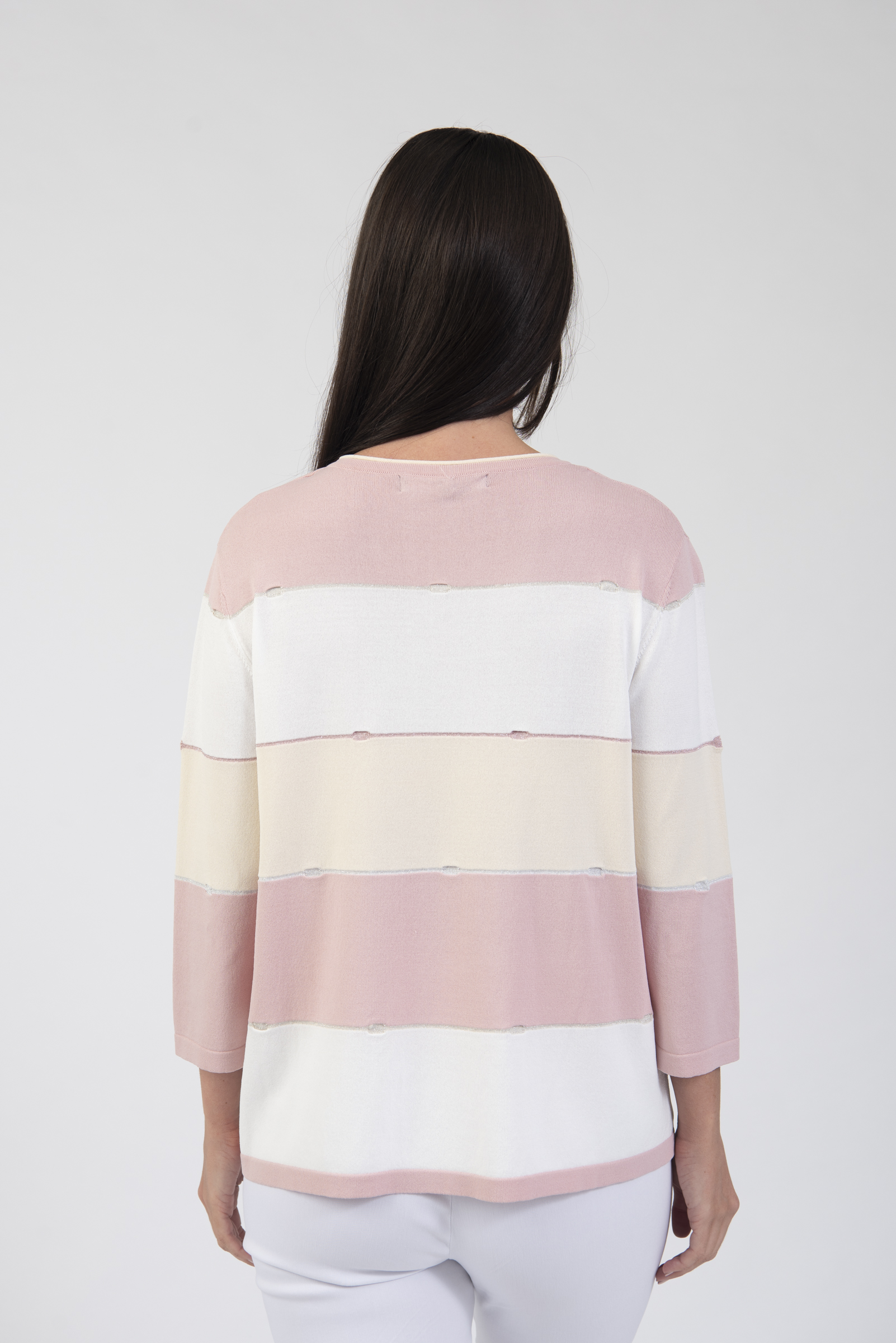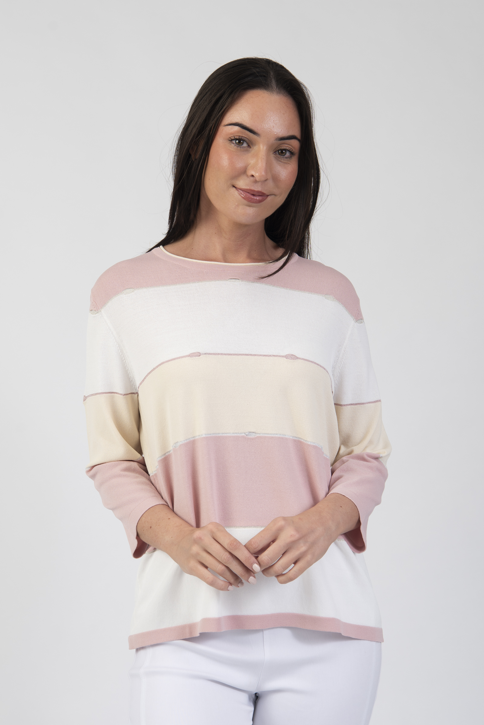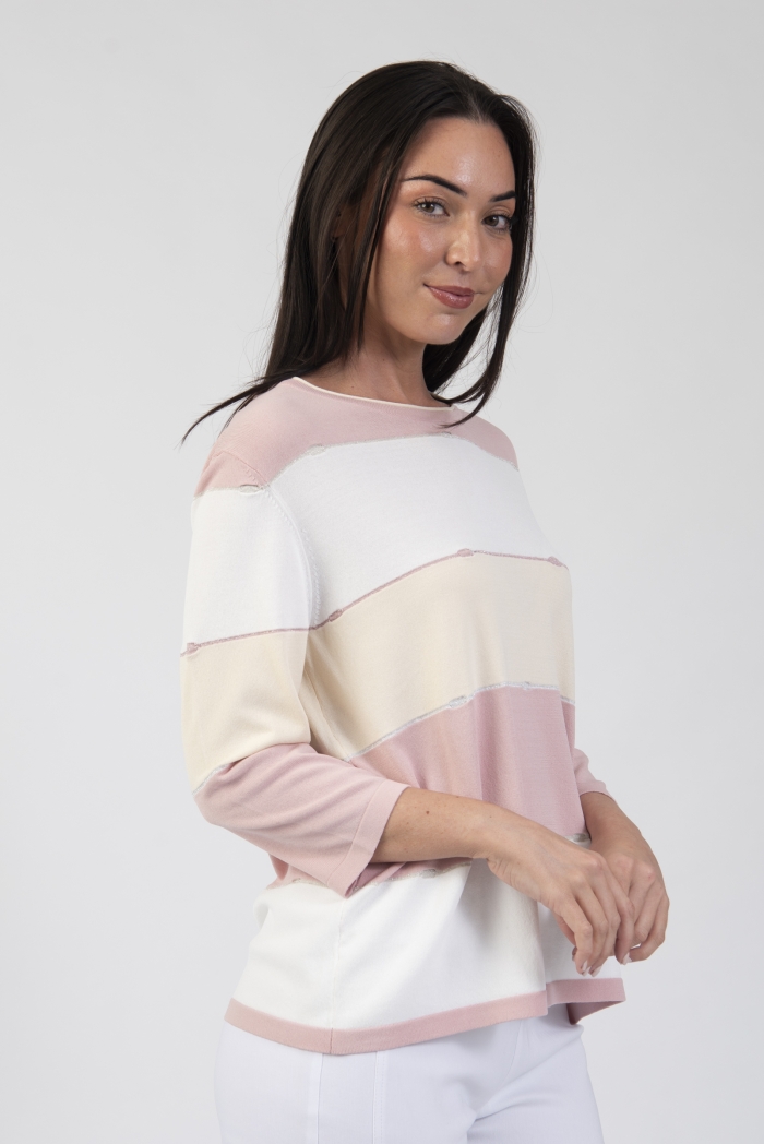 Round neck stripe sweater with 3/4 length sleeves