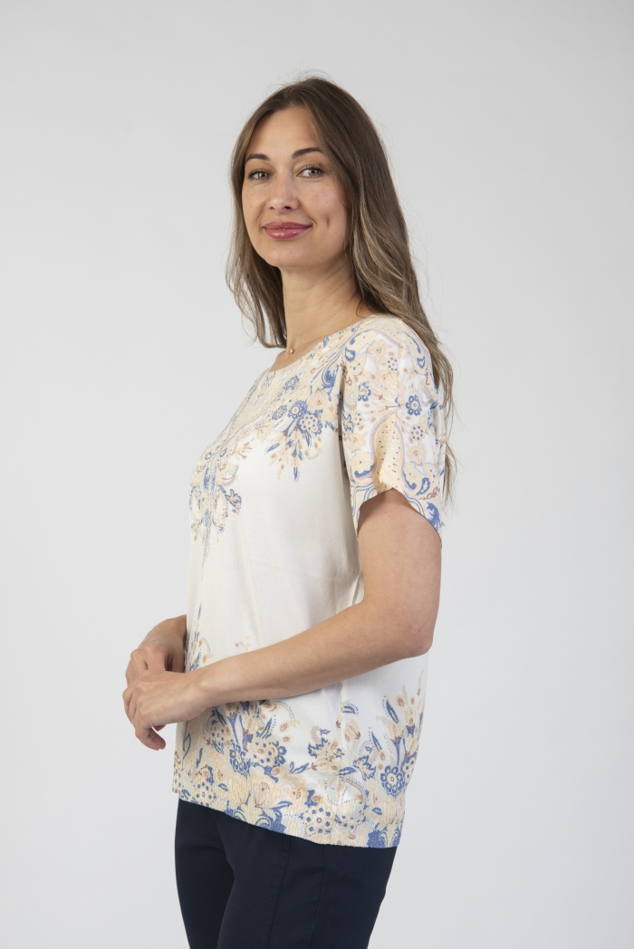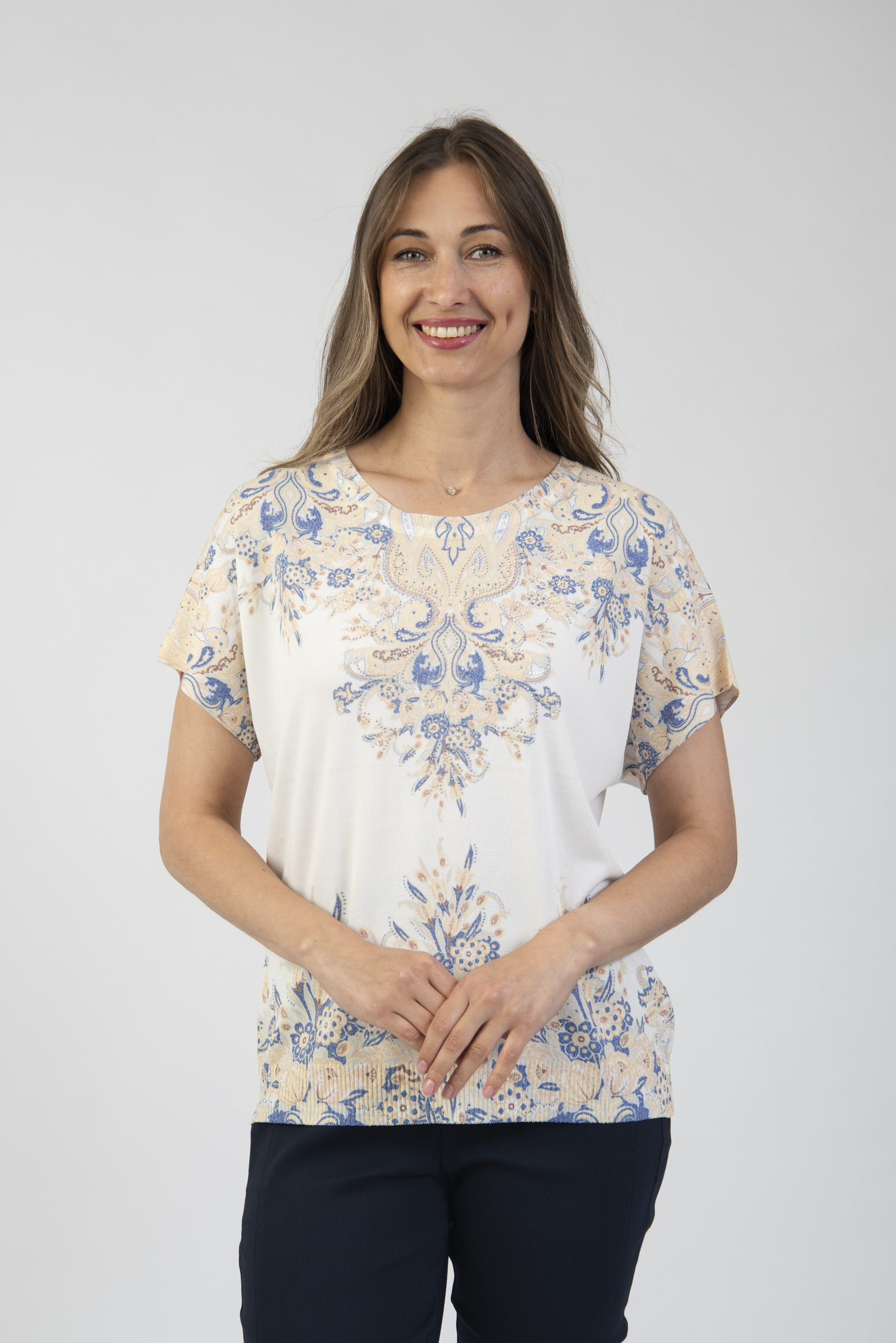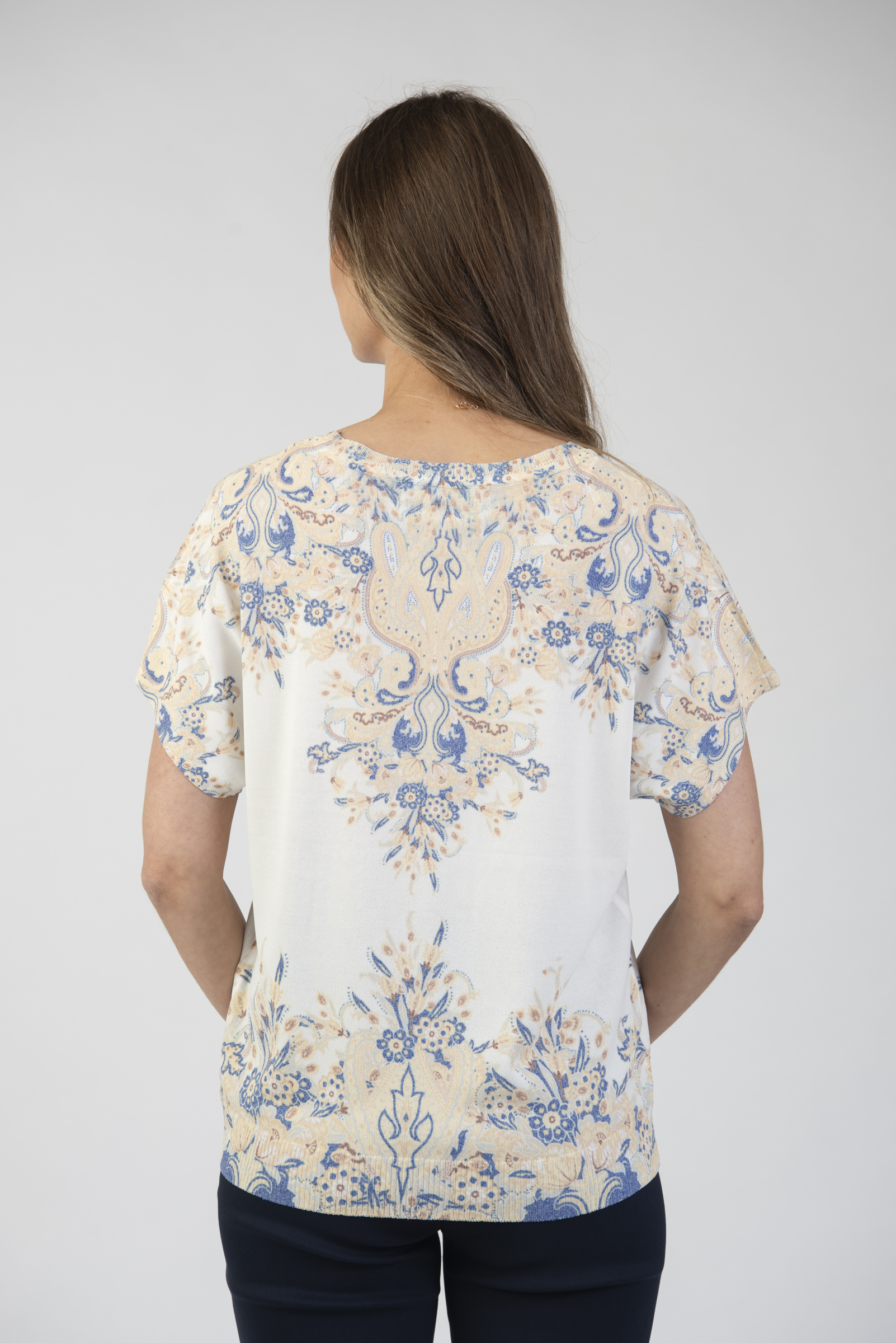 Round neck short sleeve printed knit top