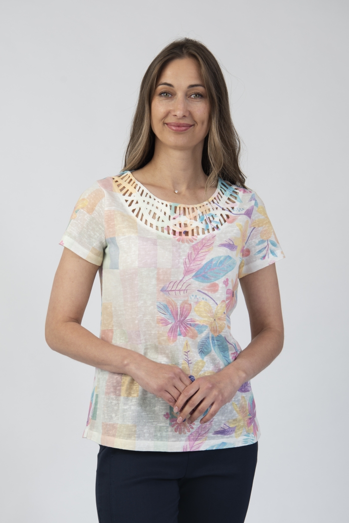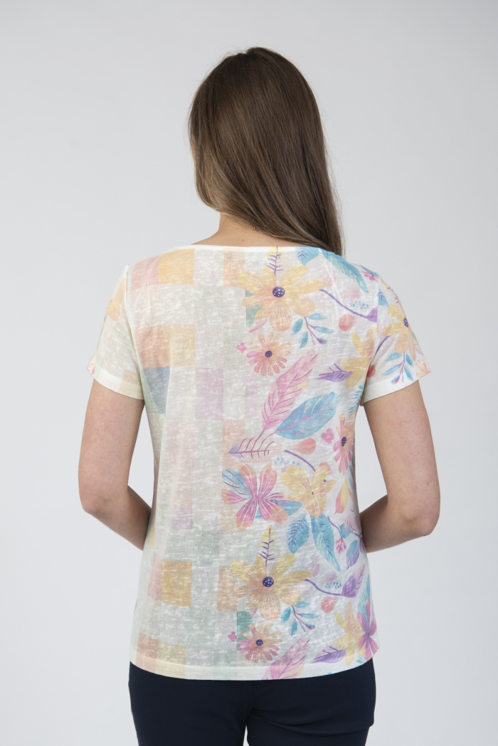 Round neck printed t-shirt with decorative neckline