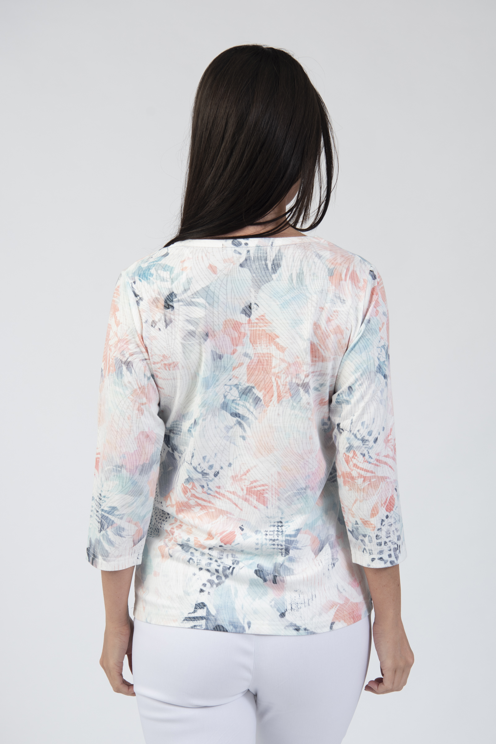 Printed round neck top with 3/4 length sleeves & diamond detail