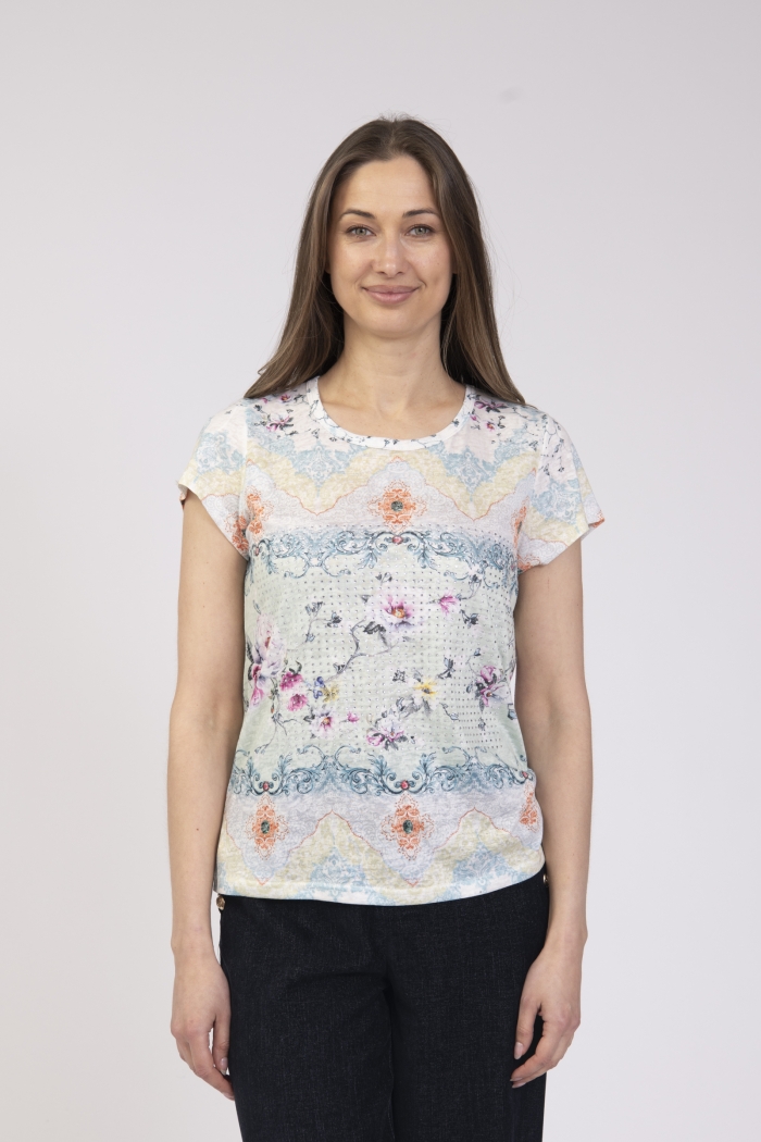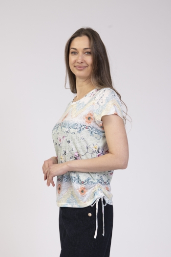 Printed round neck top with diamond details & side ties
