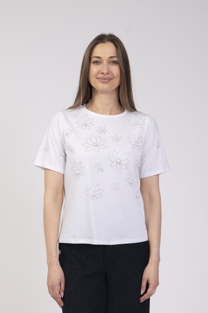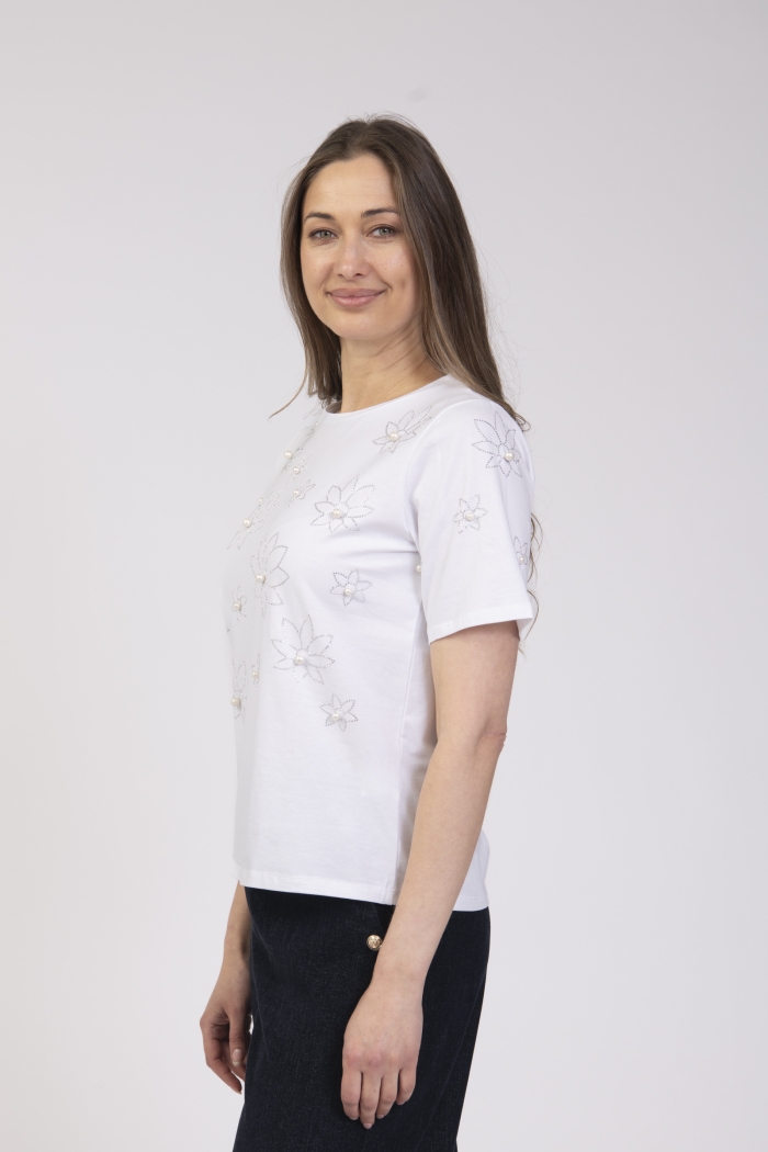 Round neck t-shirt with diamond and pearl detail