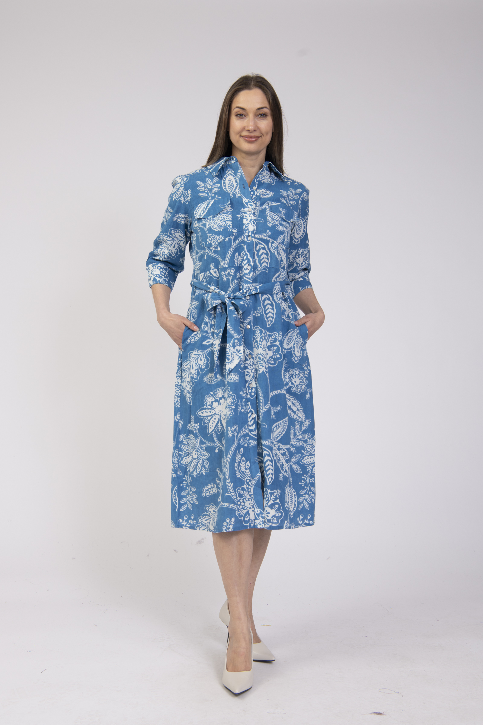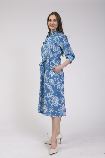 Printed button up long sleeved dress with collar & waist tie