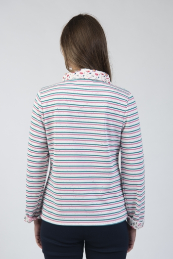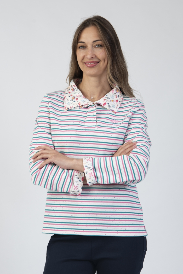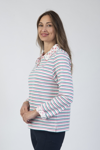 Striped half button top with contrast collar & cuff