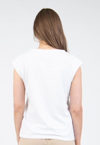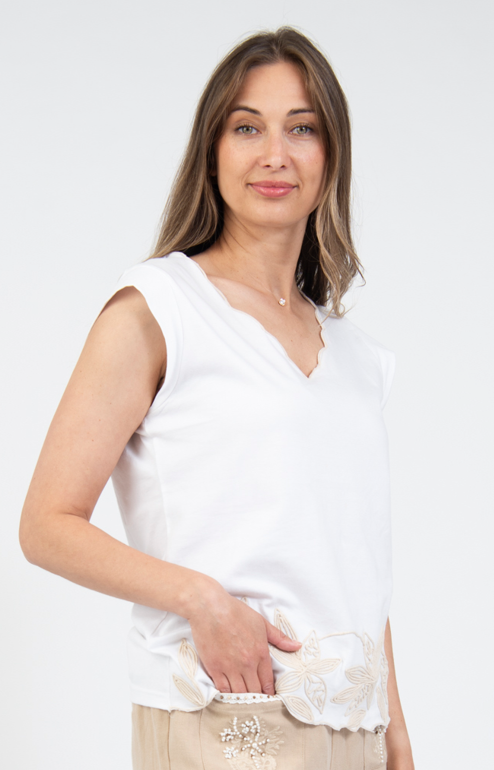 Sleeveless V-neck top with scalloped neckline & embroidery details