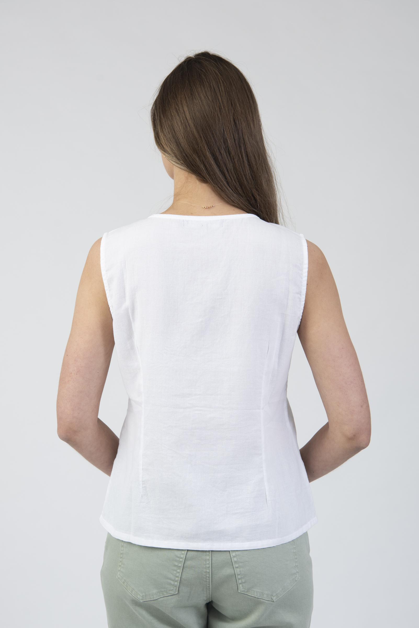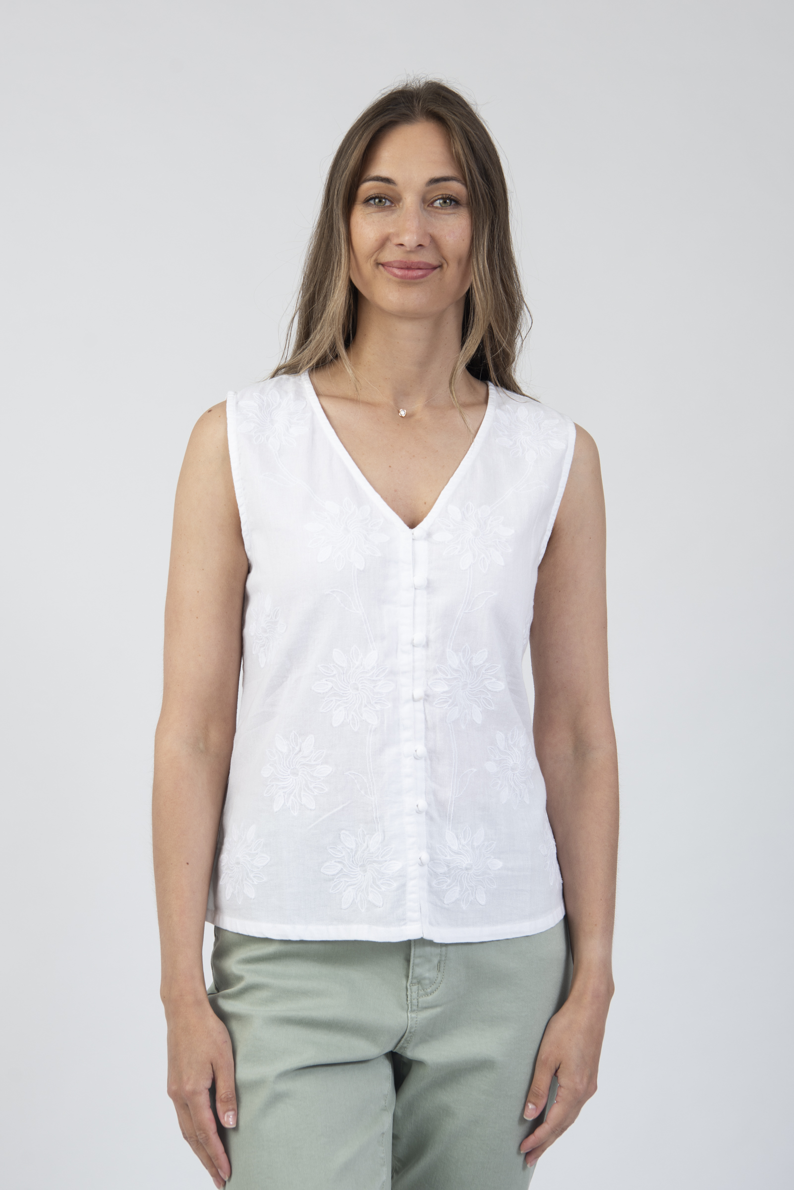 V-neck sleeveless button up top with embroidery details