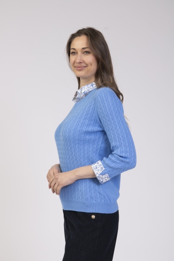 Cable knit sweater with shirt collar & 3/4 length sleeves