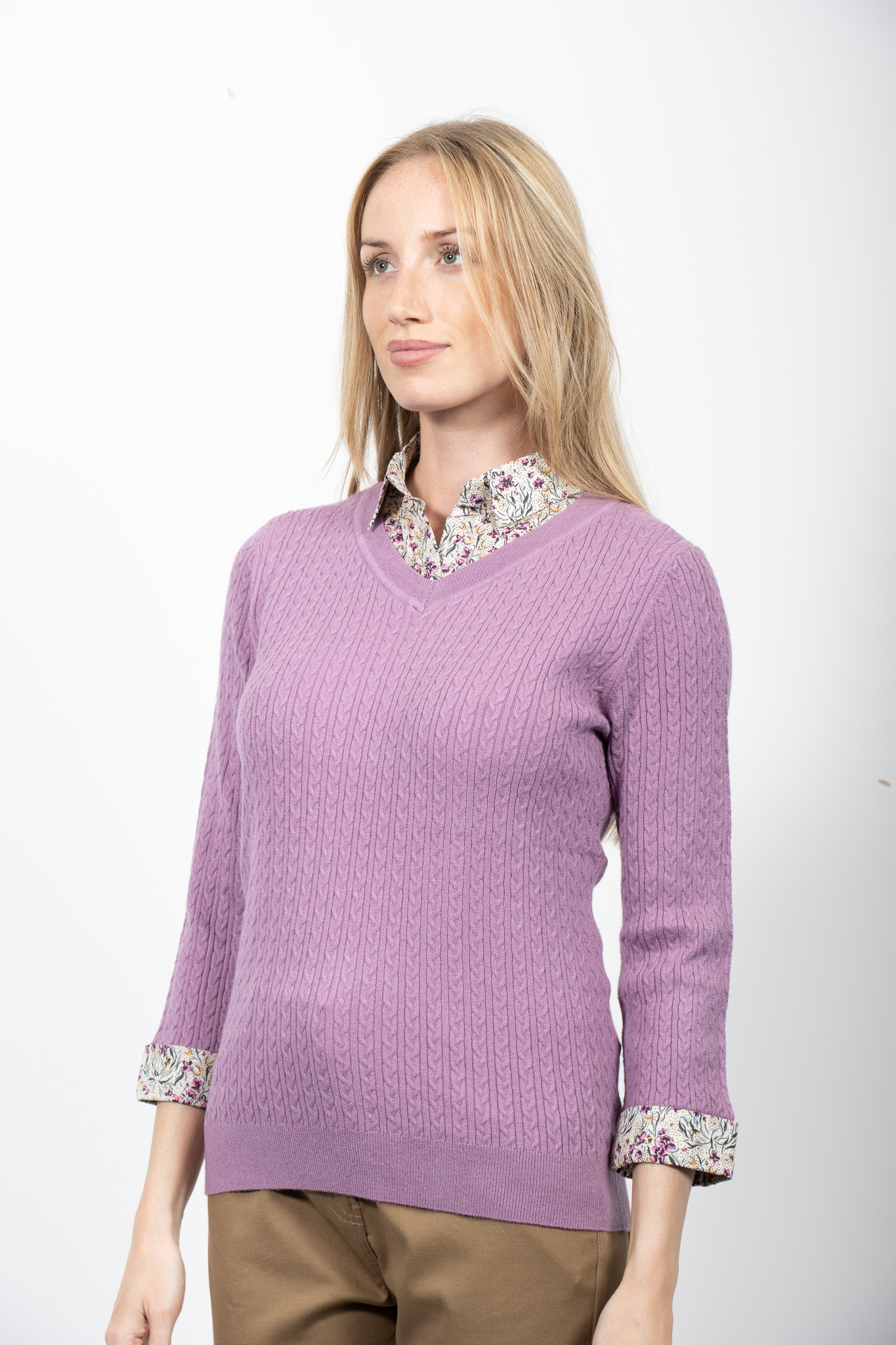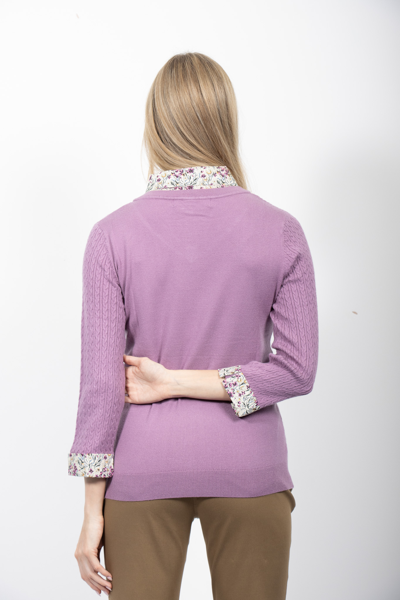 CABLE KNIT TOP WITH WOVEN SHIRT COLLAR AND CUFFS