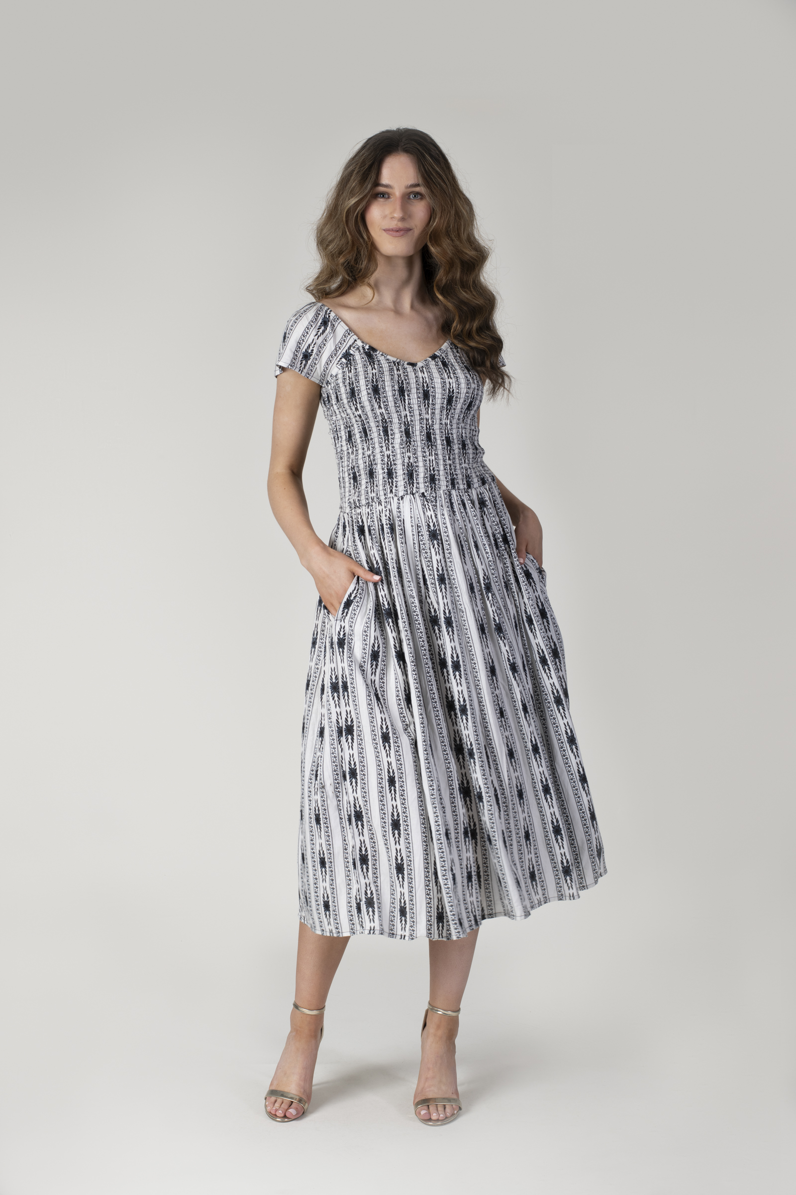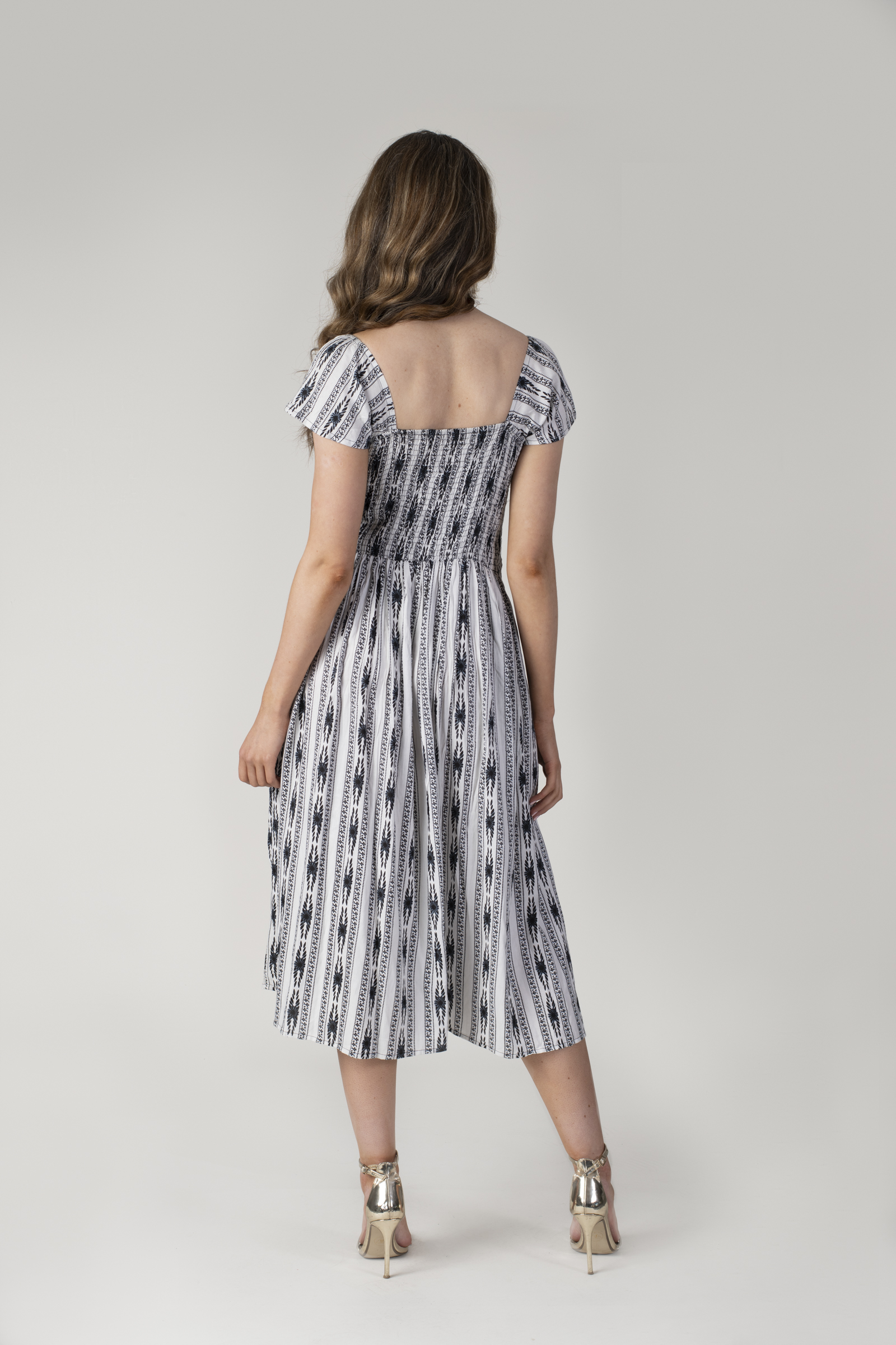 BLACK AND WHITE SHIRRED MIDI DRESS