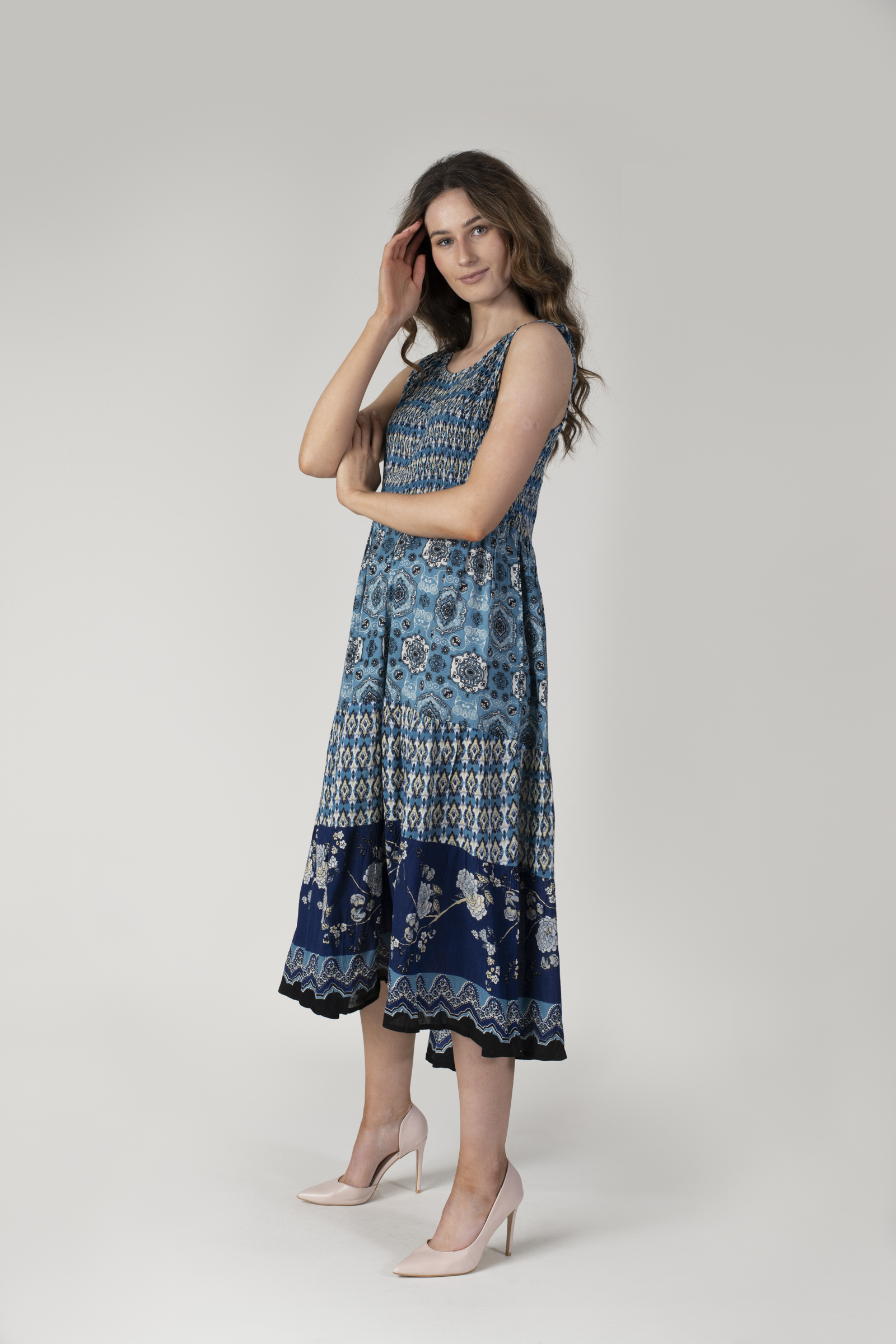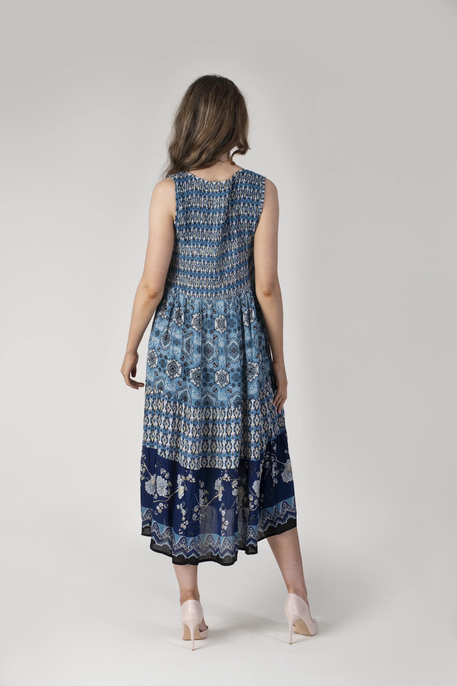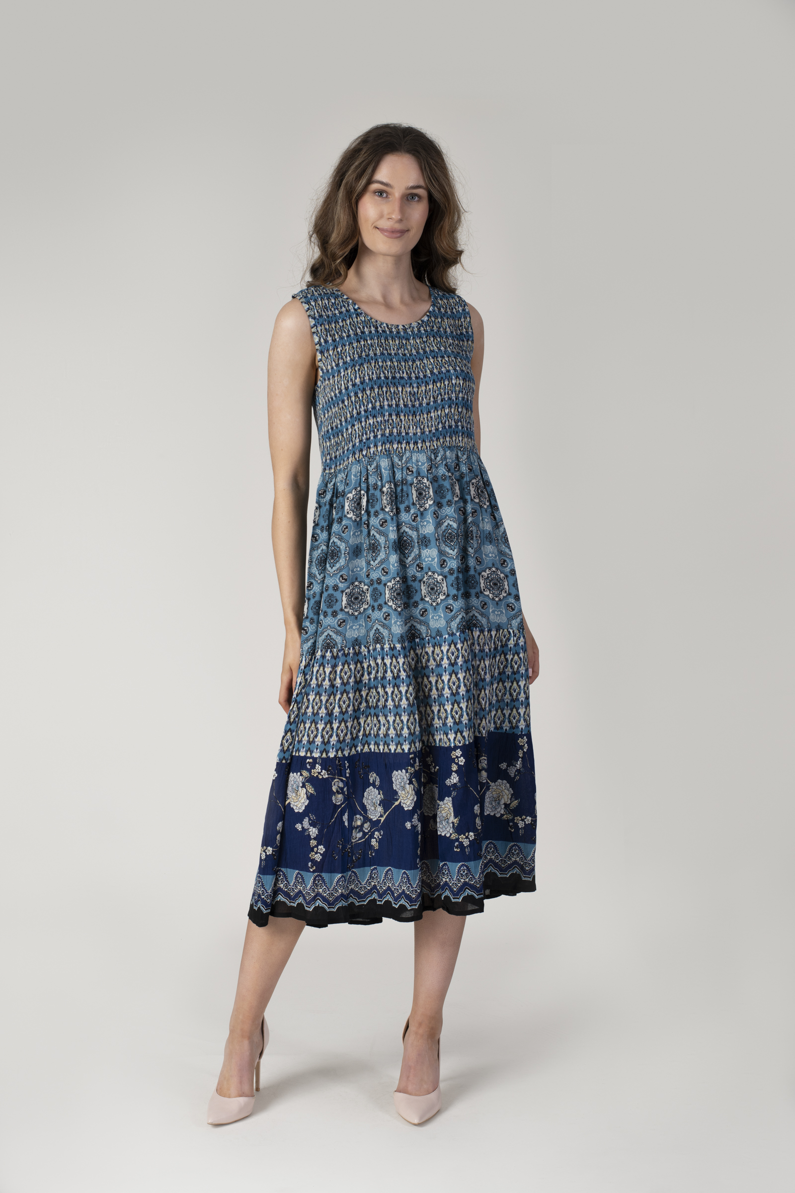 NAVY GIRAFFE AND FLORAL SHIRRED MIDI DRESS
